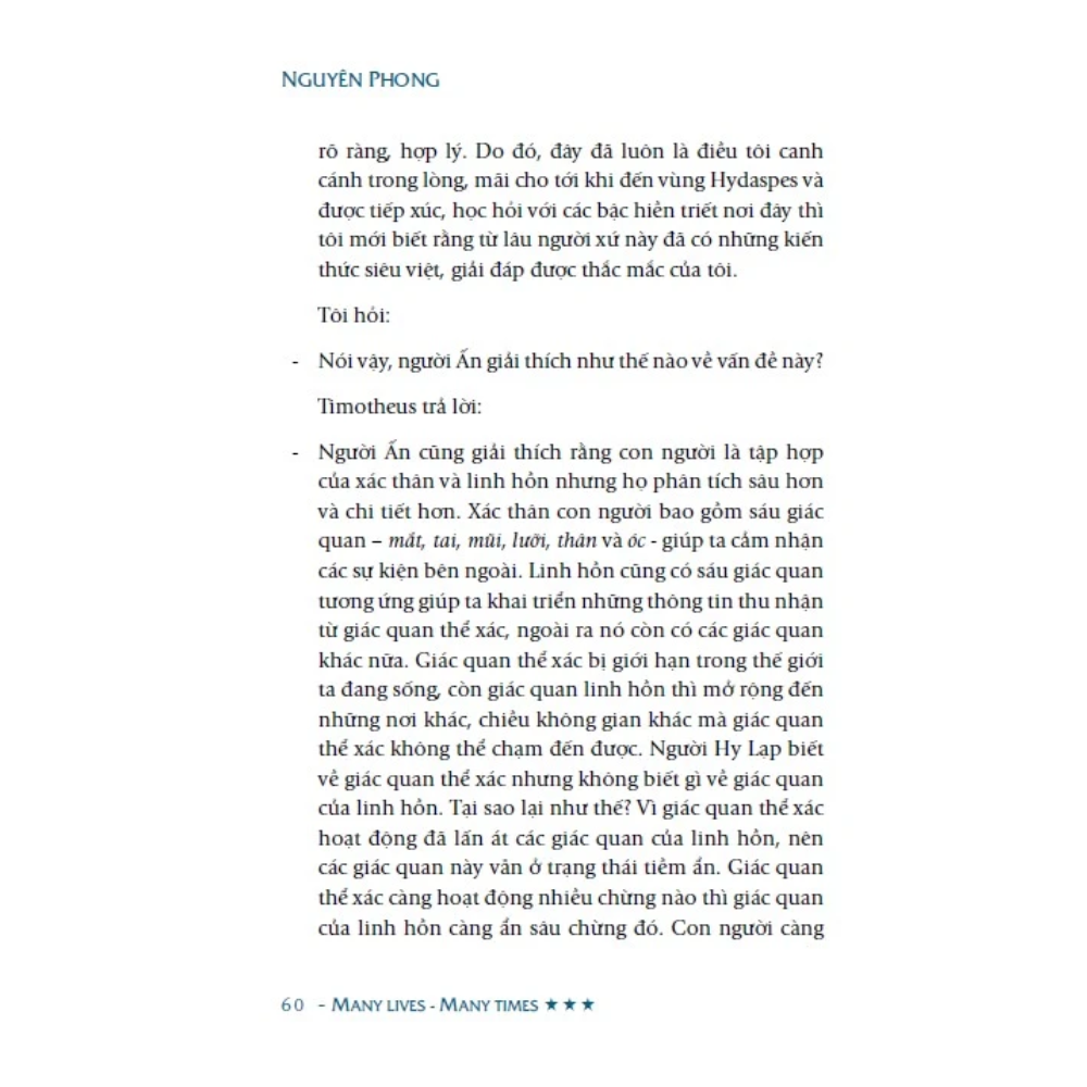 Vẫn bằng giọng văn giản dị và chừng mực, tác giả Nguyên Phong một lần nữa đưa độc giả đi qua các kiếp sống khác nhau, từ Hy Lạp, La Mã, đến Pháp thời trung cổ, rồi quay về nước Mỹ hiện đại. Ở đó, ta được trải nghiệm những hoàn cảnh khác nhau, đồng cảm với nỗi đau của nhân vật và chứng kiến sự trưởng thành của trí tuệ, để lần nữa khẳng định được rằng chính ý nghĩ, lời nói và hành động của chúng ta ở kiếp này sẽ dẫn dắt chúng ta đi về đâu ở kiếp sau. Chẳng có thần linh hay thế lực nào quyết định, chúng ta hoàn toàn chịu trách nhiệm về cuộc đời mình.