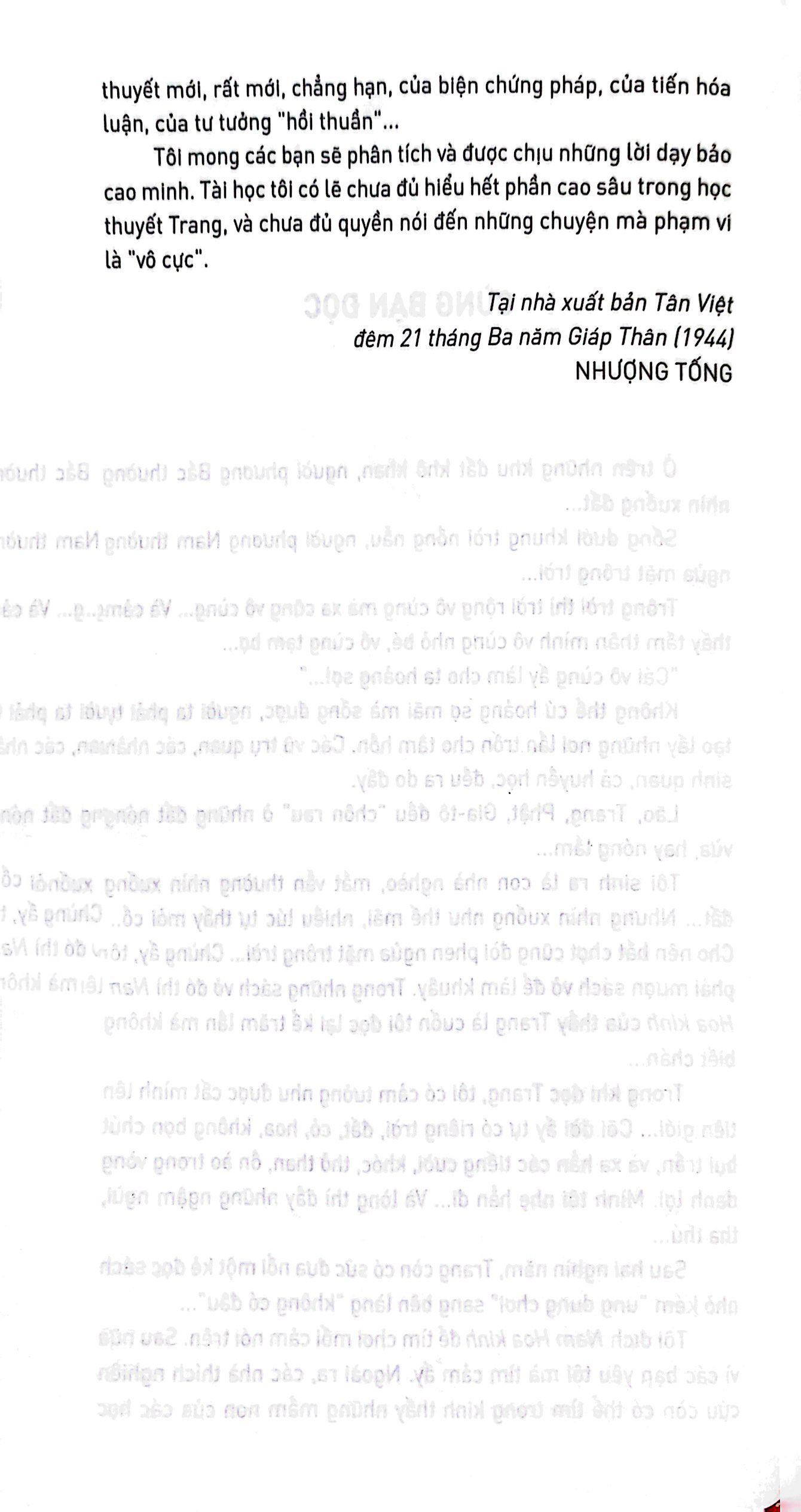 Nam Hoa kinh luôn được coi như tác phẩm sâu sắc, uyên áo bậc nhất trong số các trước tác triết học Trung Hoa. Tác phẩm bất hủ này có một ảnh hưởng lớn lao đến triết lí, văn chương, nghệ thuậ suốt trong nhiều thời đại ở cả trong lẫn ngoài Trung Hoa, và khiến tác giả của nó, Trang Tử, từ lâu đã trở thành một huyền thoại. Ở Việt Nam, Nam Hoa kinh được học giả Nhượng Tống dịch từ 1945, khá sớm so với nhiều tác phẩm kinh điển khác. Qua bản tiếng dịch tiếng Việt hàm súc, khúc chiết mà vẫn bay bổng, tài hoa của ông, Nam Hoa kinh thật sự là một trước tác luôn cần được đọc và đọc lại.
