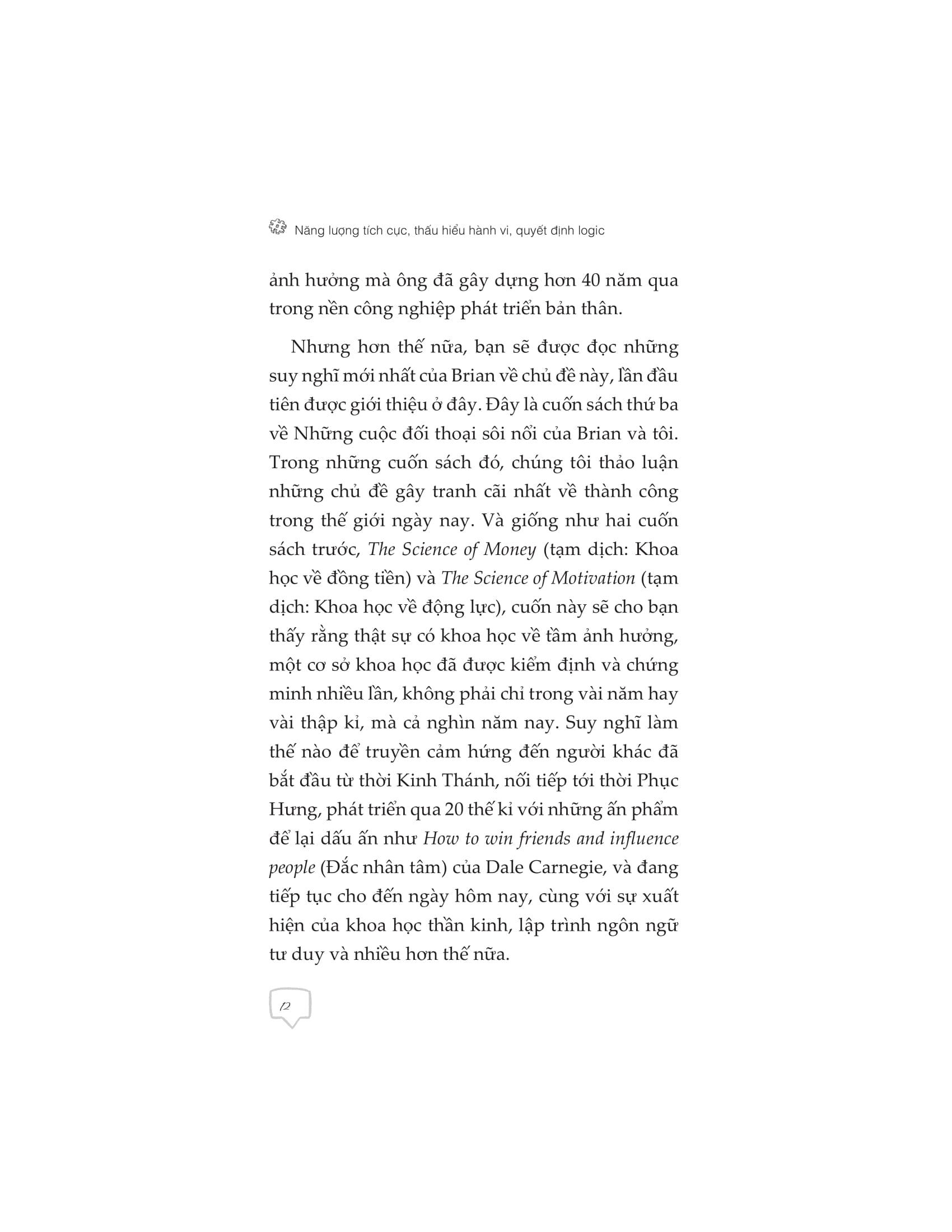 “Năng lượng tích cực, thấu hiểu hành vi, quyết định logic” sẽ giúp bạn hiểu cụ thể hơn về những quy tắc và các bước quan trọng trong việc biến kỹ năng gây ảnh hưởng trở thành thói quen trong cách suy nghĩ cũng như hành động, giúp bạn mở ra cánh cửa thành công trong sự nghiệp và cuộc sống.