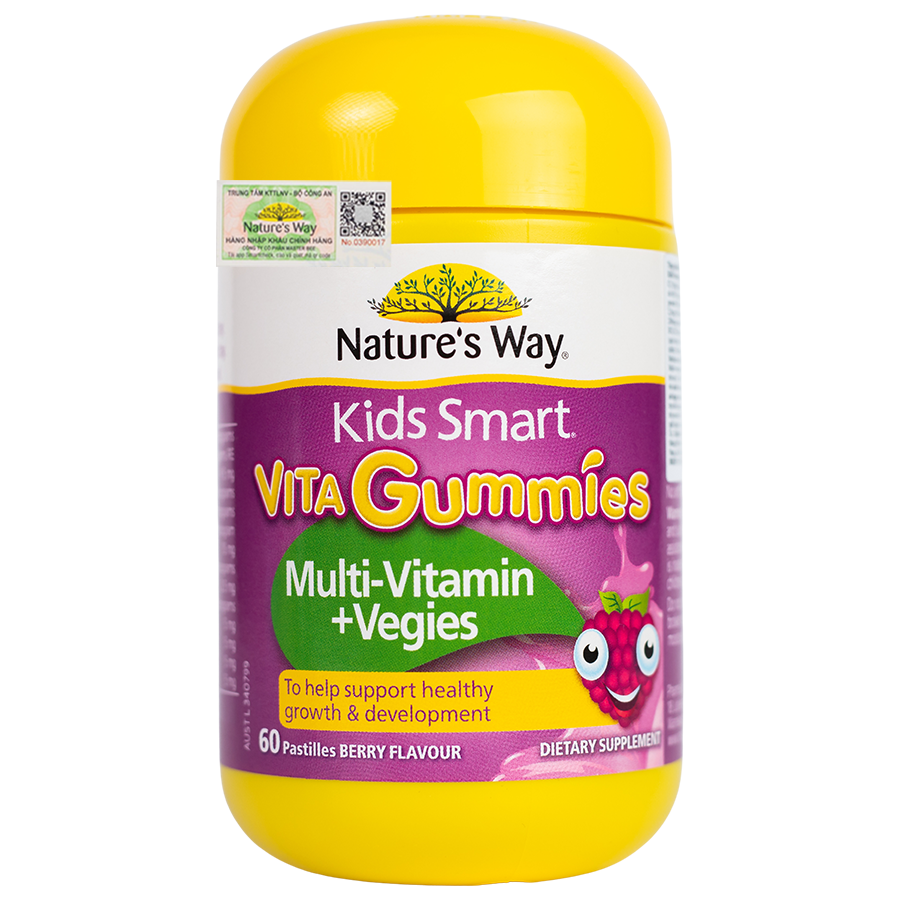 Nature's Way Kids Smart VITA GUMMIES ( VITAMIN/ VEGIES) - Vitamin Tổng Hợp (60 viên/ Lọ) Giới thiệu Nature's Way Kids Smart VITA GUMMIES là sản phẩm kẹo dẻo bổ sung vitamin và rau củ dành riêng cho trẻ em, được sản xuất bởi thương hiệu Nature's Way nổi tiếng. Sản phẩm này cung cấp một lượng lớn các vitamin và khoáng chất cần thiết cho sự phát triển toàn diện của trẻ. Thành phần Thành phần chính: Axit Ascorbic (vitamin C) 15mg; Nicotinamid (vitamin B3) 4,5mg; dl-alpha-Tocopheryl Acetate (Vitamin E 2,5IU) 2,5mg; Pyridoxin hydrochlorid (tương đương pyridoxin (vitamin B6) 500mcg) 608mcg; Retinol Palmitat (tương đương 200mcg vitamin A) 366mcg; Biotin (chứa Sucrose 3,713mg) 37,5mcg; Cyanocobalamin (vitamin B12) (chứa Sucrose 249,8mcg) 0,25mcg; Cholecalciferol (Vitamin D3) 1,25mcg; Spinacia oleracea (Spinach) leaf powder (bột lá cải bó xôi) 5mg; Daucus carota (Carrot) root powder (bột củ cà rốt) 5mg; Beta vulgaris (Beetroot) root powder (Bột củ cải ngọt) 5mg; Cynara scolymus (Artichoke) flower bud powder (Bột nụ hoa Atisô) (chứa Maltodextrin 550mcg) 5mg. Phụ liệu: Glucose lỏng; Sucrose; Nước tinh khiết; Gelatin 250 bloom; Chất điều chỉnh độ axit (Axit citric-330); Dầu dừa phân đoạn; Chất điều chỉnh độ axit (Axit malic-296), Chất tạo màu tự nhiên - bột cà chua; Hương liệu tổng hợp (vị dâu; vị việt quất; vị quả mâm xôi). Đặc điểm nổi bật Kids Smart Vita Gummies Multivitamin Vegies Nature's Way là giải pháp giúp bé cân bằng dinh dưỡng bên cạnh bữa ăn hằng ngày. Sản phẩm bổ sung các loại vitamin A, C, D3, E, vitamin nhóm B (B3, B6, B7), thêm một số rau củ dạng bột (cà rốt, cải bó xôi, củ cải ngọt, bột nụ hoa atiso) mang nhiều nguyên tố vi lượng và chất xơ giúp bù đắp lượng vitamin và các dưỡng chất bị thiếu hụt. Nhờ đó, trẻ ăn uống ngon miệng hơn, tăng trưởng và phát triển toàn diện hơn. Bổ sung vitamin và rau củ Kẹo dẻo Kids Smart Vita Gummies Multivitamin Vegies Nature's Way bổ sung dinh dưỡng ngoài bữa ăn hằng ngày với đủ lượng vitamin và khoáng chất từ thực phẩm, đặc biệt hỗ trợ: Tăng trưởng và phát triển lành mạnh; Duy trì chức năng não bộ; Bảo vệ thị lực mắt; Nâng cao hệ thống miễn dịch; Tăng cường hoạt động tiêu hóa. Viên dinh dưỡng dẻo thơm thú vị Có những bé tỏ ra khó chịu khi bị bố mẹ ép uống những viên nhộng hoặc viên thuốc cứng. Đây là lí do Kids Smart Vita Gummies Multivitamin Vegies Nature's Way được thiết kế dạng viên nhai dẻo mềm. Bên cạnh giúp trẻ cảm thấy ngon miệng và vui thú mỗi khi nhai kẹo, đây còn là cách để trẻ tập làm quen dần với việc nuốt một viên thuốc mà không cần đến một cuộc đấu tranh gay gắt khi bạn muốn bổ sung dinh dưỡng cho trẻ. Tất cả những dưỡng chất tự nhiên được gói trọn trong viên nhai hương vị quả mọng tự nhiên, chua chua ngọt ngọt làm bé thích thú thưởng thức và sẽ khiến trẻ nhớ đến việc uống vitamin mỗi ngày mà không cần bố mẹ nhắc nhở. Công dụng Bổ sung vitamin và chất dinh dưỡng từ rau củ quả. Hỗ trợ tăng trưởng và phát triển tối ưu cho bé.​ Hướng dẫn sử dụng Uống 1 viên/ngày hoặc theo chỉ dẫn của chuyên gia. Dành cho trẻ từ 4 tuổi trở lên Hướng dẫn bảo quản Bảo quản nơi khô ráo, thoáng mát, tránh ánh nắng trực tiếp. Để xa tầm tay trẻ em. Tiêu chuẩn an toàn Sản phẩm được sản xuất theo tiêu chuẩn GMP, đảm bảo chất lượng và an toàn. Lưu ý sử dụng Sản phẩm này không phải là thuốc và không có tác dụng thay thế thuốc chữa bệnh. Không dùng cho người mẫn cảm với bất kỳ thành phần nào của sản phẩm.   Nếu có bất kỳ dấu hiệu bất thường nào, hãy ngưng sử dụng và tham khảo ý kiến bác sĩ Khuyến cáo Để đạt hiệu quả tốt nhất, nên kết hợp sử dụng sản phẩm với chế độ ăn uống cân bằng, giàu chất xơ và uống đủ nước. Tham khảo ý kiến bác sĩ, dược sĩ trước khi sử dụng, đặc biệt đối với trẻ em có bệnh lý nền.