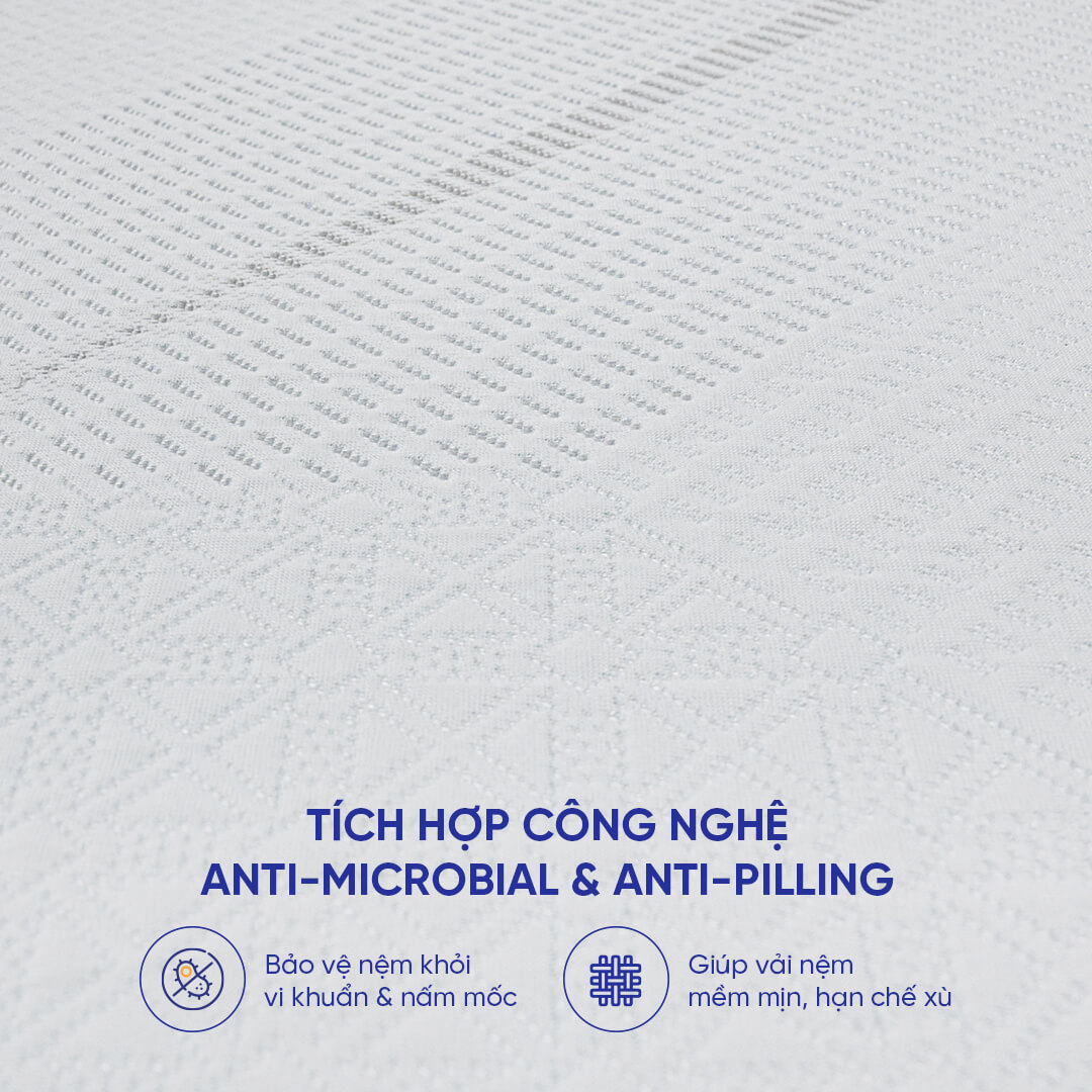 Nệm Comfy Cloud 1.0 ngăn ngừa tối đa môi trường vi khuẩn nhờ công nghệ Anti-microbial được phủ trên vải áo nệm. Công nghệ này giúp nệm có khả năng chủ động loại bỏ các vi khuẩn, nấm mốc, mạt giườ Hơn nữa, sợi vải Cool Polyamide trên bề mặt gia tăng khả năng chống nước giúp hạn chế môi trường ẩm ướt để tránh phát sinh vi khuẩn.