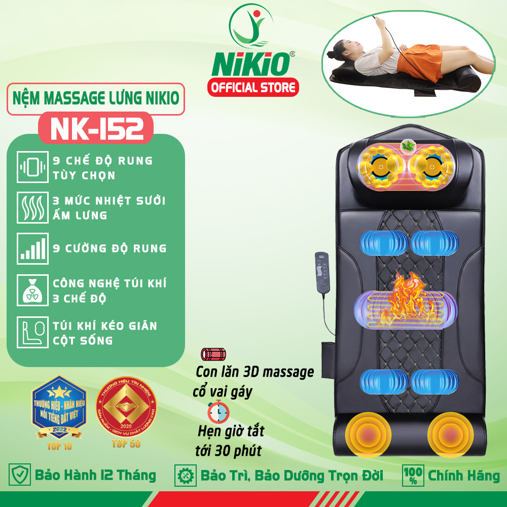 Nệm massage đa năng Nikio NK-152 là sản phẩm chăm sóc sức khỏe được nhiều người yêu thích hiện nay. Sản phẩm được thiết kế nhỏ gọn, có thể gấp gọn để trên ô tô, sử dụng tại văn phòng, Với chức năng rung, xoa bóp con lăn, xoa bóp túi khí và nhiệt sưởi, nệm giúp xua tan nhanh các cơn đau đau lưng, mỏi cổ sau một ngày dài làm việc căng thẳng. Sử dụng nệm massage toàn thân Nikio NK-152 mỗi ngày giúp bạn ăn ngon, ngủ ngon, tinh thần được cải thiện hiệ quả. Hãy mua ngay một chiếc đệm massage Nikio NK-152 để có những phút giây thư giãn tuyệt vời tại nhà nhé.