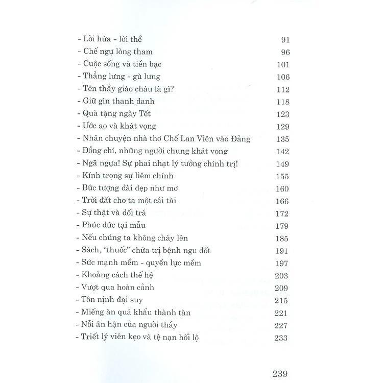 Với 40 bài viết, mỗi bài là một câu chuyện chất chứa những suy tư, chiêm nghiệm của tác giả trước những vấn đề nóng bỏng của xã hội và thời đại, những vấn đề còn cần phải bàn đến trong công tác xây dựng Đảng như: trách nhiệm công dân, gương người tốt, việt tốt, nhận thức về lý tưởng của người vào Đảng, trách nhiệm của người đảng viên, sự nêu gương của cán bộ lãnh đạo, trọng dụng người tài đức, các biểu hiện suy thoái tư tưởng chính trị, đạo đức, lối sống của không ít cán bộ, đảng viên…