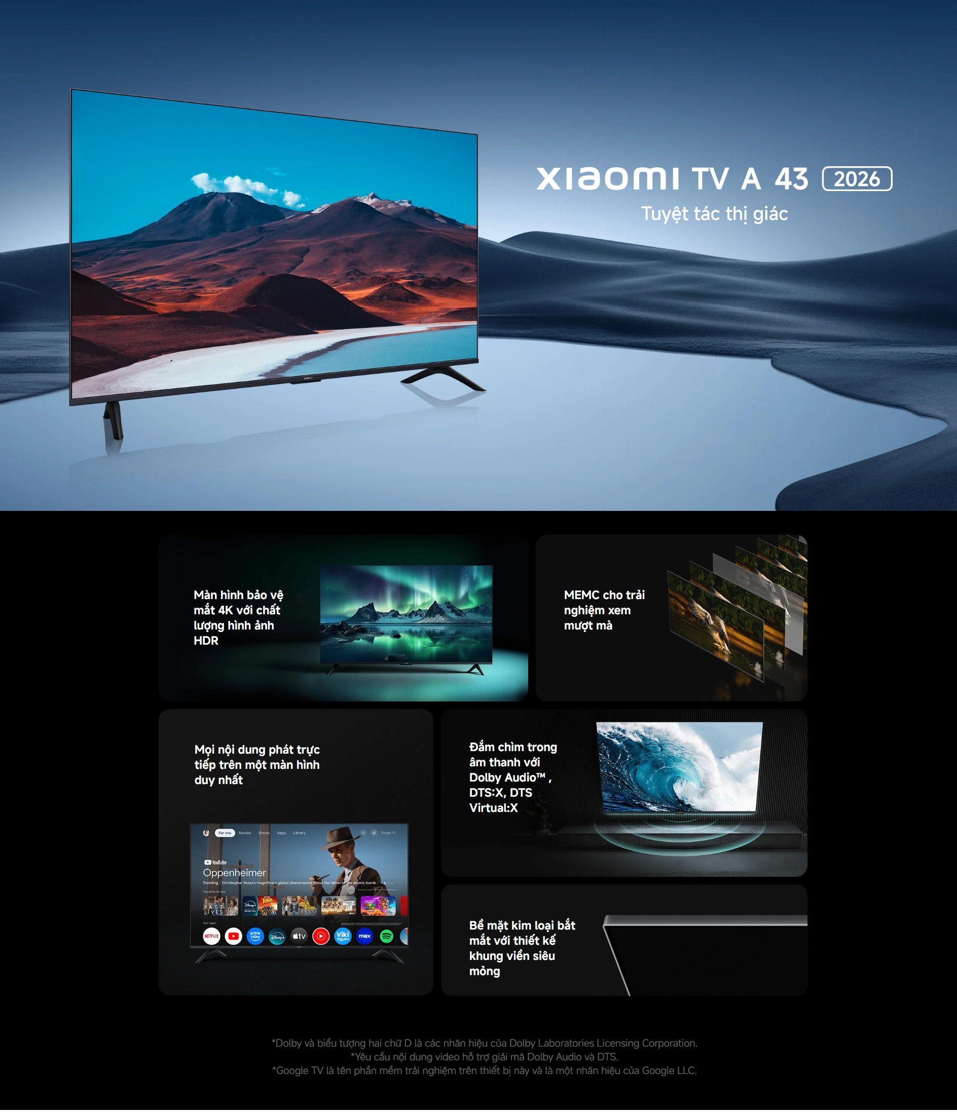 Tivi Xiaomi 43 inch A Google TV 2026 – chiếc TV mang đến trải nghiệm hình ảnh sắc nét 4K kết hợp công nghệ HDR tối ưu độ tương phản và màu sắc. Với công nghệ MEMC, mọi chuyển động trở nên mượt mà, sống động như thật. Âm thanh đa chiều được nâng tầm với Dolby Audio, DTS:X và DTS Virtual:X, giúp bạn đắm chìm trong không gian giải trí chân thực. Thiết kế viền mỏng tinh tế, lớp kim loại sang trọng góp phần làm nổi bật không gian sống hiện đại của bạn. Tất cả nội dung yêu thích – từ phim ảnh, chương trình đến ứng dụng – đều hội tụ trên một giao diện Google TV thân thiện và thông minh.
