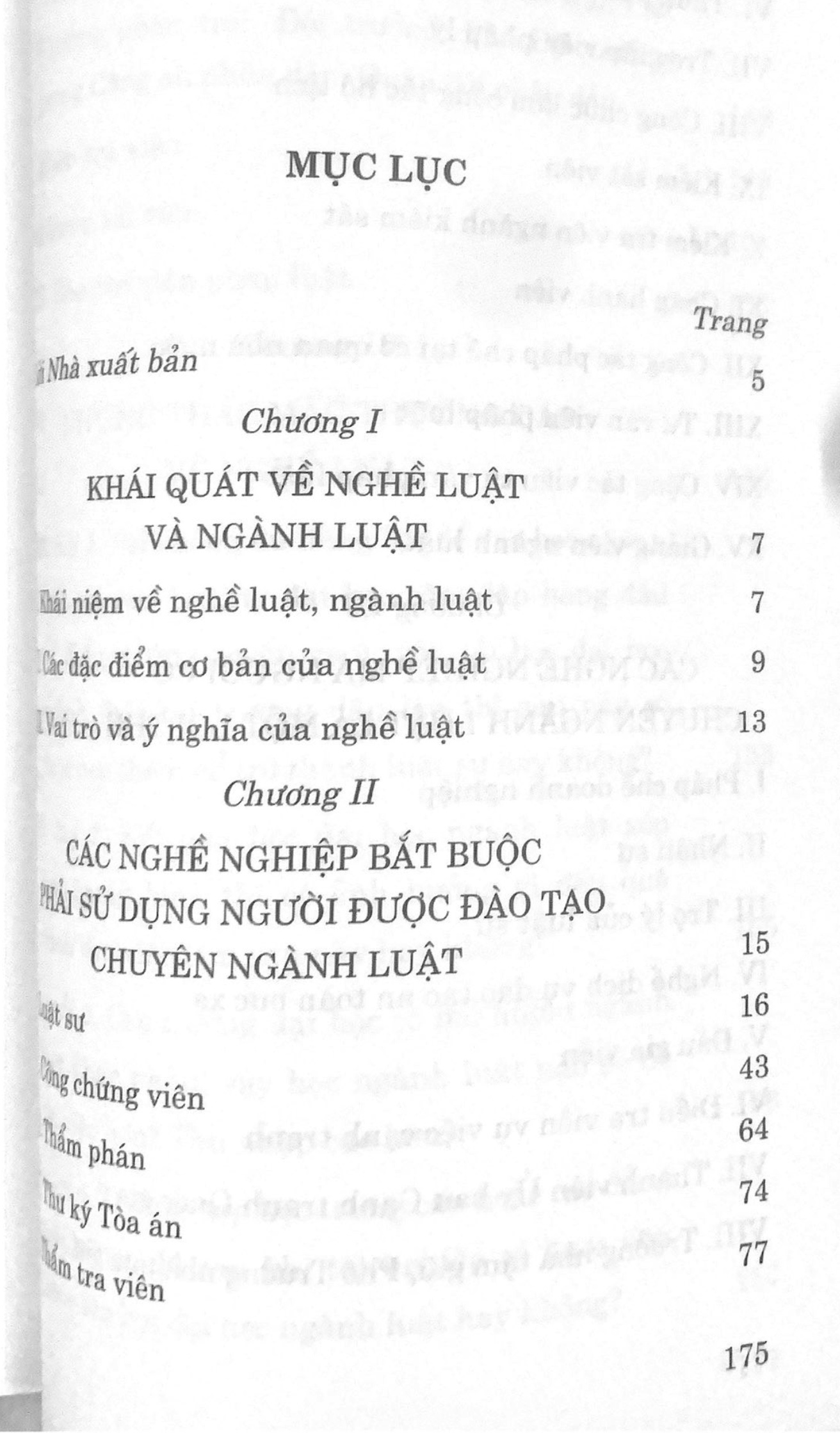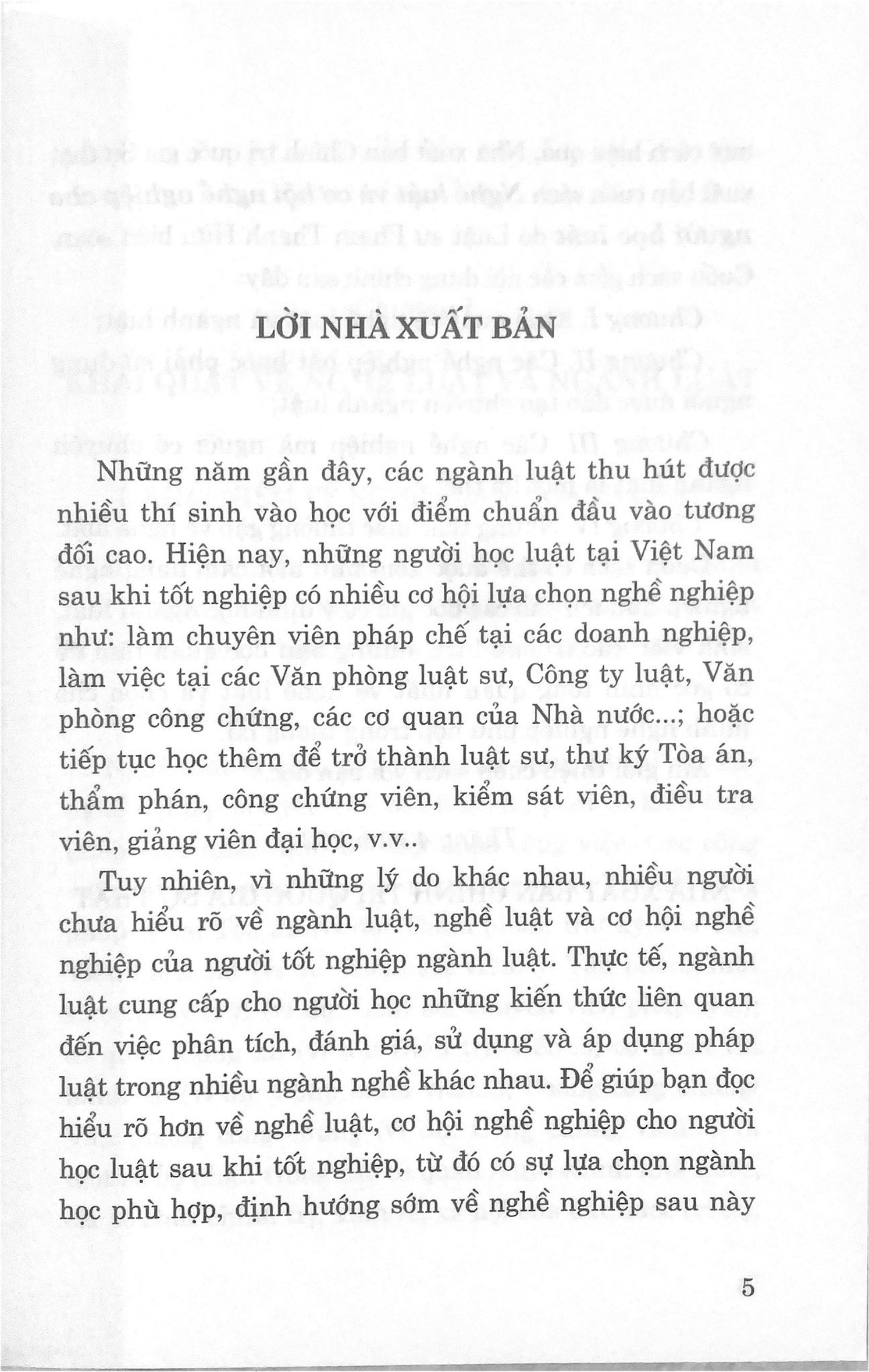 Nghề Luật và cơ hội nghề nghiệp cho người học luật Tác giả: Luật sư Phạm Thanh Hữu Nhà xuất bản: Chính Trị Quốc Gia Sự Thật Khổ sách: 14.5*20.5cm Năm phát hành: 5.2024 Công ty phát hành: Nhà xuất bản Chính Trị Quốc Gia Sự Thật Giá bìa: 54.000đ Số trang: 180 trang Hình thức bìa: Bìa mềm Cuốn sách gồm các nội dung chính sau đây: Chương I: khái quát về nghề luật và ngành luật. Chương II: các nghề nghiệp bắt buộc phải sử dụng người được đào tạo chuyên ngành luật. Chương III: các nghề nghiệp mà người có chuyên ngành luật là một lợi thế. Chương IV: những thắc mắc thường gặp về nghề luật.