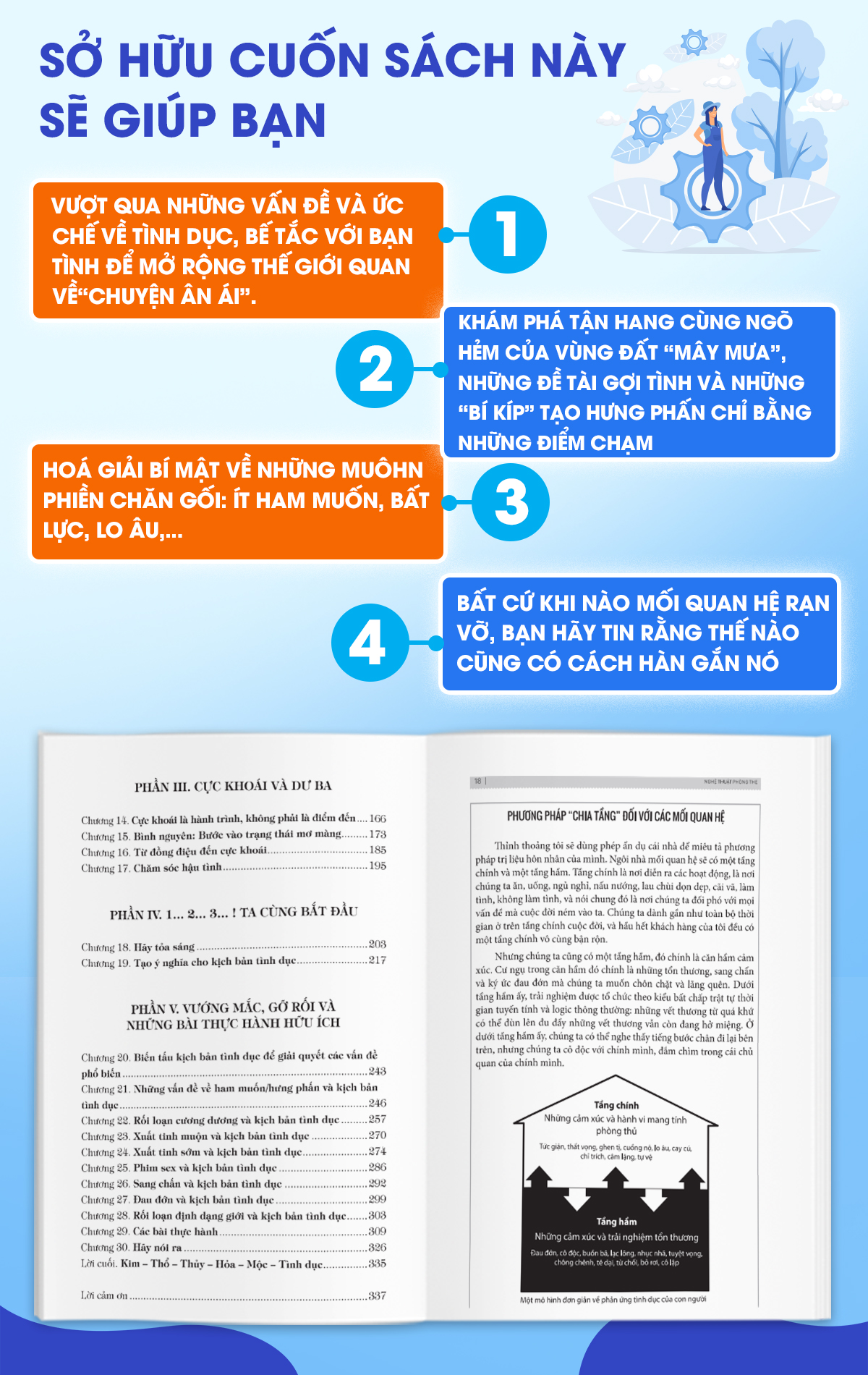 Nghệ Thuật Phòng The – Để Cuộc Yêu Thăng Hoa sẽ giúp bạn vượt qua những vấn đề và ức chế về tình dục, giúp bạn kết nối lại những chỗ “lệch pha”, những bất tương đồng và bế tắc với bạn tình để mở rộng thế giới quan về “chuyện ân ái”. Nhờ đó, bạn sẽ không cảm thấy chán mà thay vào đó là một đời sống tình dục phong phú và thăng hoa.