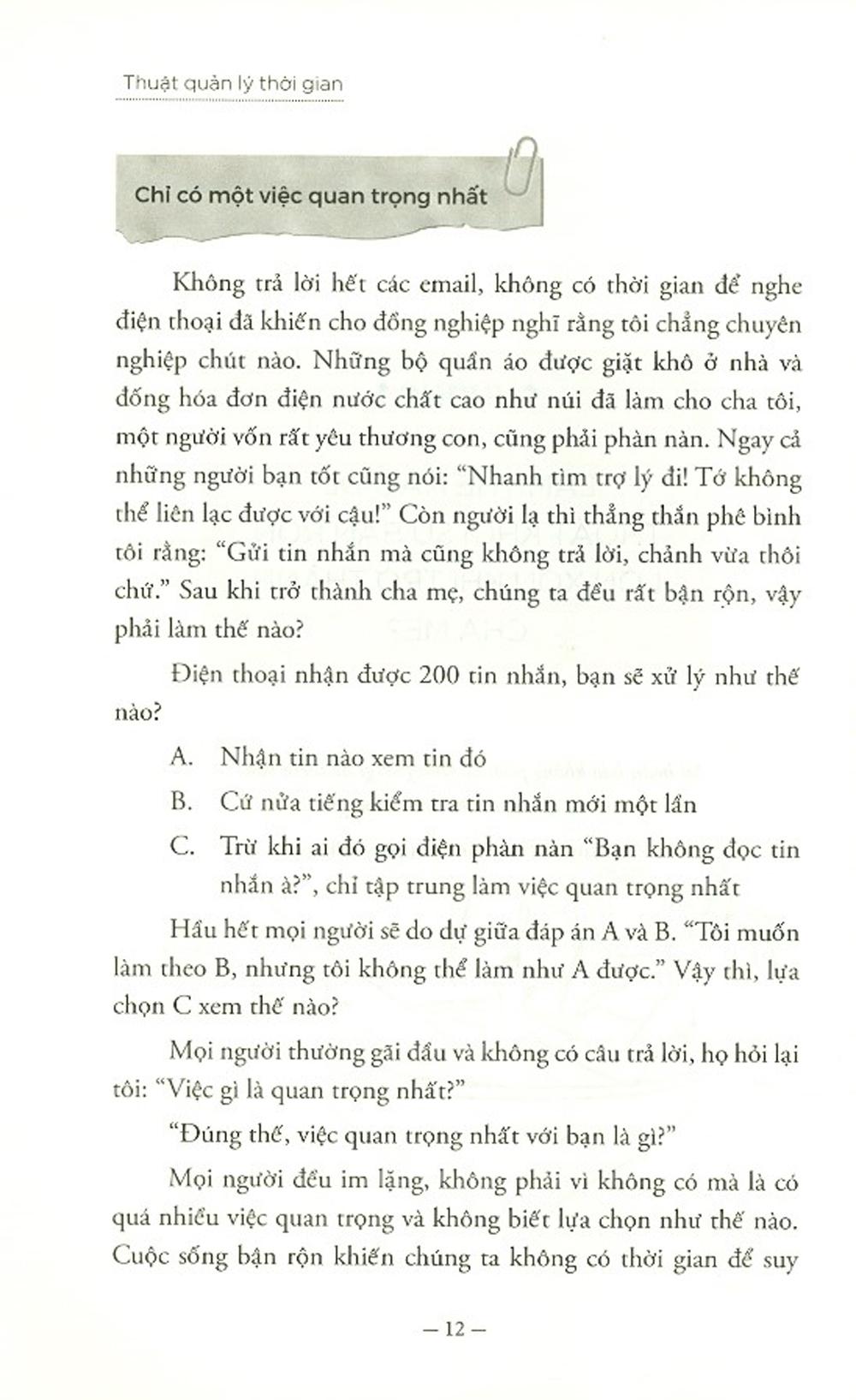 Quản lý thời gian là quản lý cảm xúc, năng lượng, là quản lý cuộc sống, cuộc đời của mình với những công việc khi có thêm một sinh linh mới khiến ta trở thành cha mẹ. Cuốn Nghệ thuật quản lý thời gian của cha mẹ sẽ giúp chúng ta hiểu thêm về nghệ thuật làm cha mẹ, nghệ thuật sống, và nhiều triết lý nhân sinh sâu sắc. Làm cha mẹ là sống thêm một cuộc đời nữa, một lần trẻ thơ nữa và là cách những người có mong muốn làm cha mẹ trưởng thành thêm khi có con.