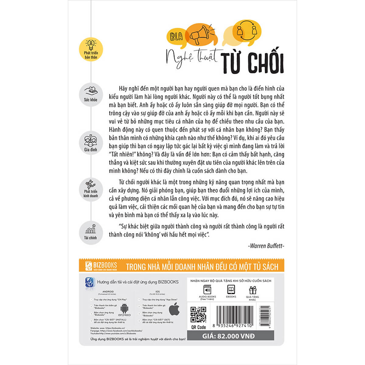 Nghệ Thuật Từ Chối – Cách Nói Không Mà Vẫn Có Được Đồng Thuận Bí quyết đưa ra lời Từ chối mà không làm tổn hại các mối quan hệ nằm “Nghệ Thuật Từ Chối – Cách Nói Không Mà Vẫn Có Được Đồng Thuận” giúp bạn tìm hiểu nguyên nhân và đưa ra cách từ chối “nhẹ nhàng”. Cuốn sách chia quy trình Từ chối thành những bước như- Chuẩn bị từ chối, đưa ra từ chối và hoàn tất từ chối - cuốn sách hướng dẫn bạn phương pháp nói Không hiệu quả, mạnh mẽ nhất, bạn có thể thực hiện ngay trong đời sống, công việc và các mối quan hệ.