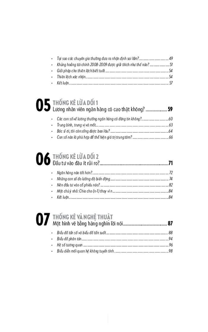 Trong cuốn sách này, bạn đọc sẽ tiếp cận những điều rất thú vị về thống kê học và phân tích dữ liệu mà không được dạy trong một lớp học thông thường. Bạn cũng sẽ tìm hiểu về một số sai lầm thường gặp khi nhìn vào các con số trong nghiên cứu hoặc đưa ra bởi truyền thông. Bạn sẽ thấy rằng những con số thống kê có mặt ở mọi lúc mọi nơi trong cuộc sống của chúng ta và chúng có thể cho bạn những cách nhìn mới về thế giới xung quanh.