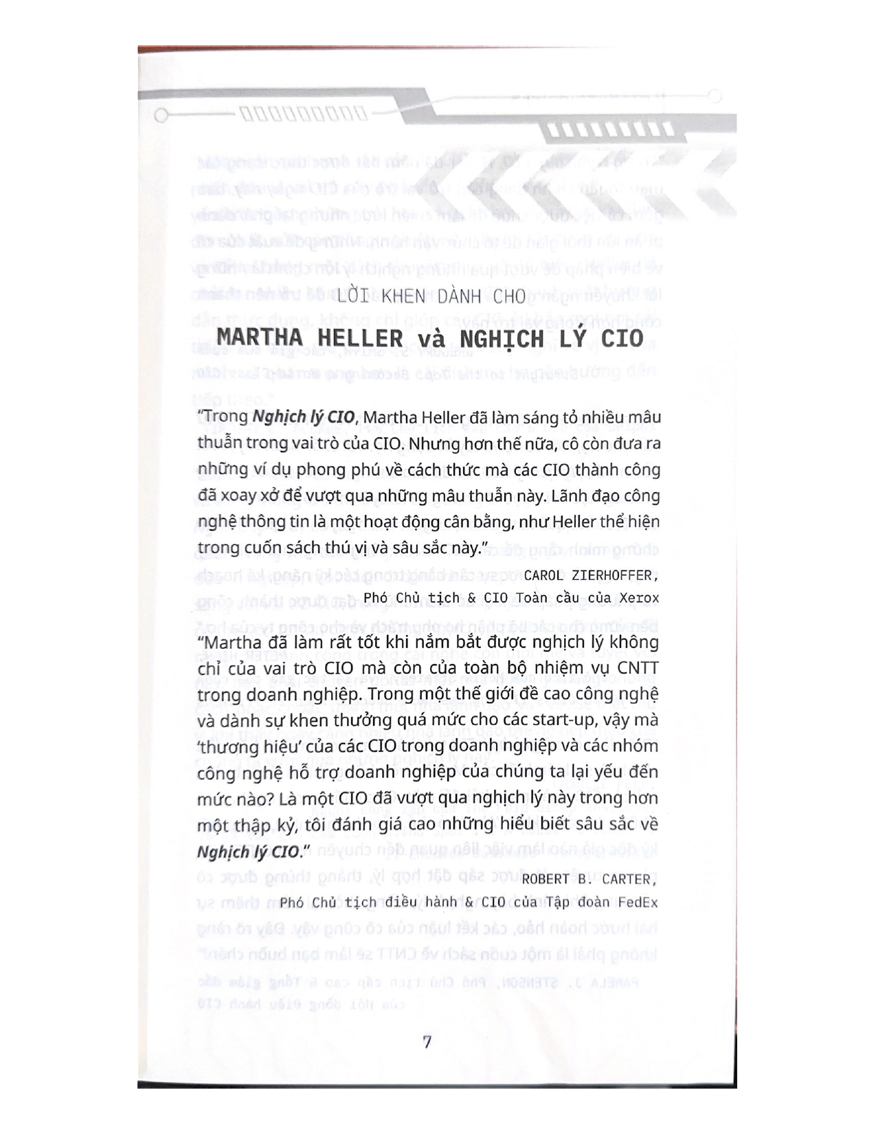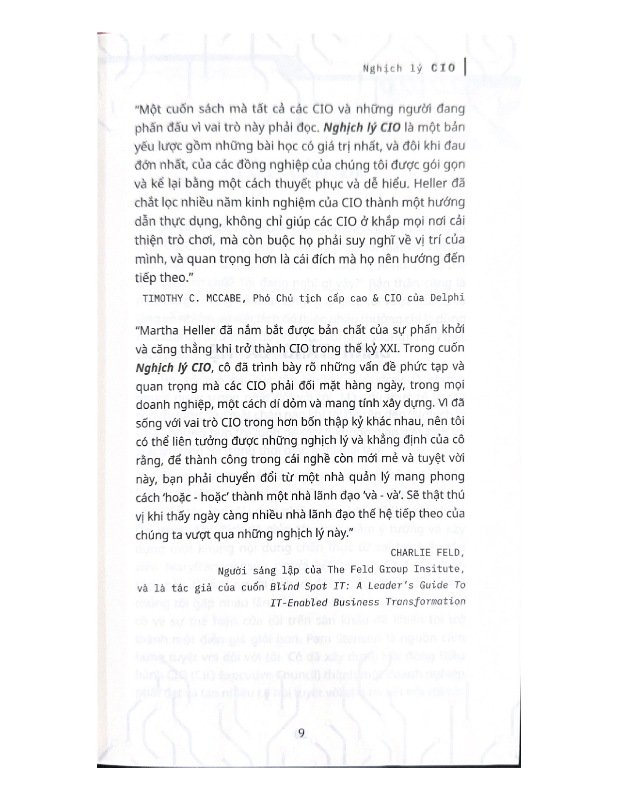 - Giới thiệu Nghịch Lý CIO - Hóa Giải Các Mâu Thuẫn Của Lãnh Đạo IT Trong Nghịch lý CIO, Heller đã nắm bắt được thực trạng các mâu thuẫn chính đang cản trở vai trò của CIO ngày nay, bao gồm cả việc được thuê để làm chiến lược nhưng lại phải dành phần lớn thời gian để tổ chức vận hành. Những đề xuất của cô về biện pháp để vượt qua những nghịch lý lớn chính là những lời khuyên ngắn gọn và hữu ích cho các CIO để trở nên thành công hơn trong vai trò này.”