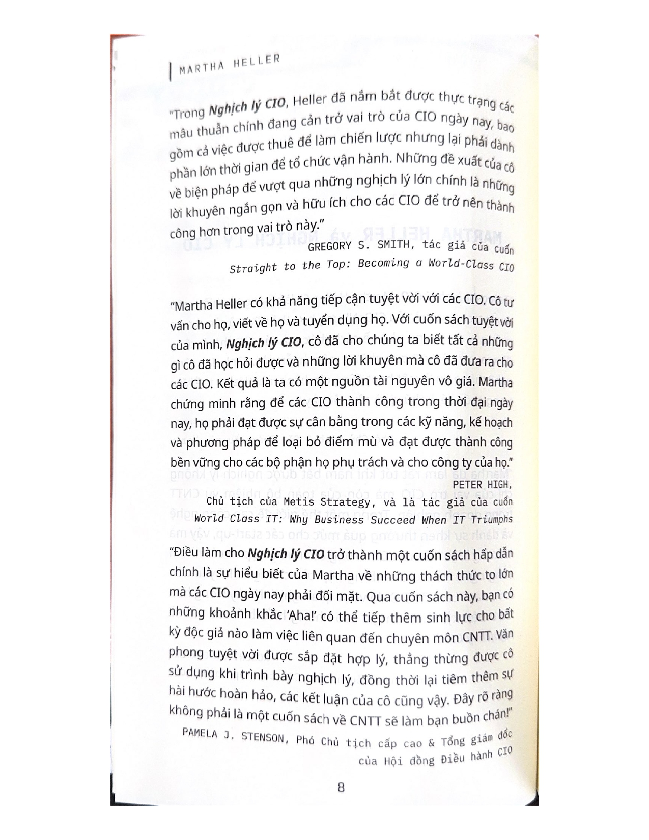 - Gregory S. Smith, tác giả của cuốn Straight to the Top: Becoming a World-Class CIO Martha Heller có khả năng tiếp cận tuyệt vời với các CIO. Cô tư vấn cho họ, viết về họ và tuyển dụng họ. Với cuốn sách tuyệt vời của mình, Nghịch lý CIO, Martha đã cho chúng ta biết tất cả những gì cô đã học hỏi được và những lời khuyên mà cô đã đưa ra cho các CIO. Kết quả là ta có một nguồn tài nguyên vô giá. Martha chứng minh rằng, để các CIO thành công trong thời đại ngày nay, họ phải đạt được sự cân bằng trong các kỹ năng, kế hoạch và phương pháp để loại bỏ điểm mù và đạt được thành công bền vững cho các bộ phận họ phụ trách và cho công ty của họ.”
