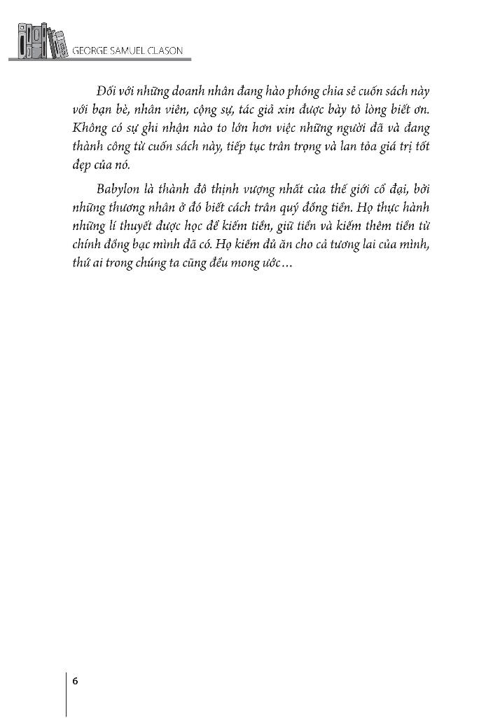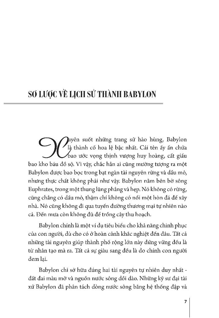 Ngày nay, tiền bạc vẫn có những ảnh hưởng lớn đối với cuộc sống con người, cũng giống như cách đây năm ngàn năm nó đã chi phối mạnh mẽ cuộc sống của cư dân vương quốc Babylon, thúc đẩy họ tìm hiểu và nắm bắt các quy luật tạo ra tiền, nhằm có được một cuộc sống sung túc và sang trọng bậc nhất.