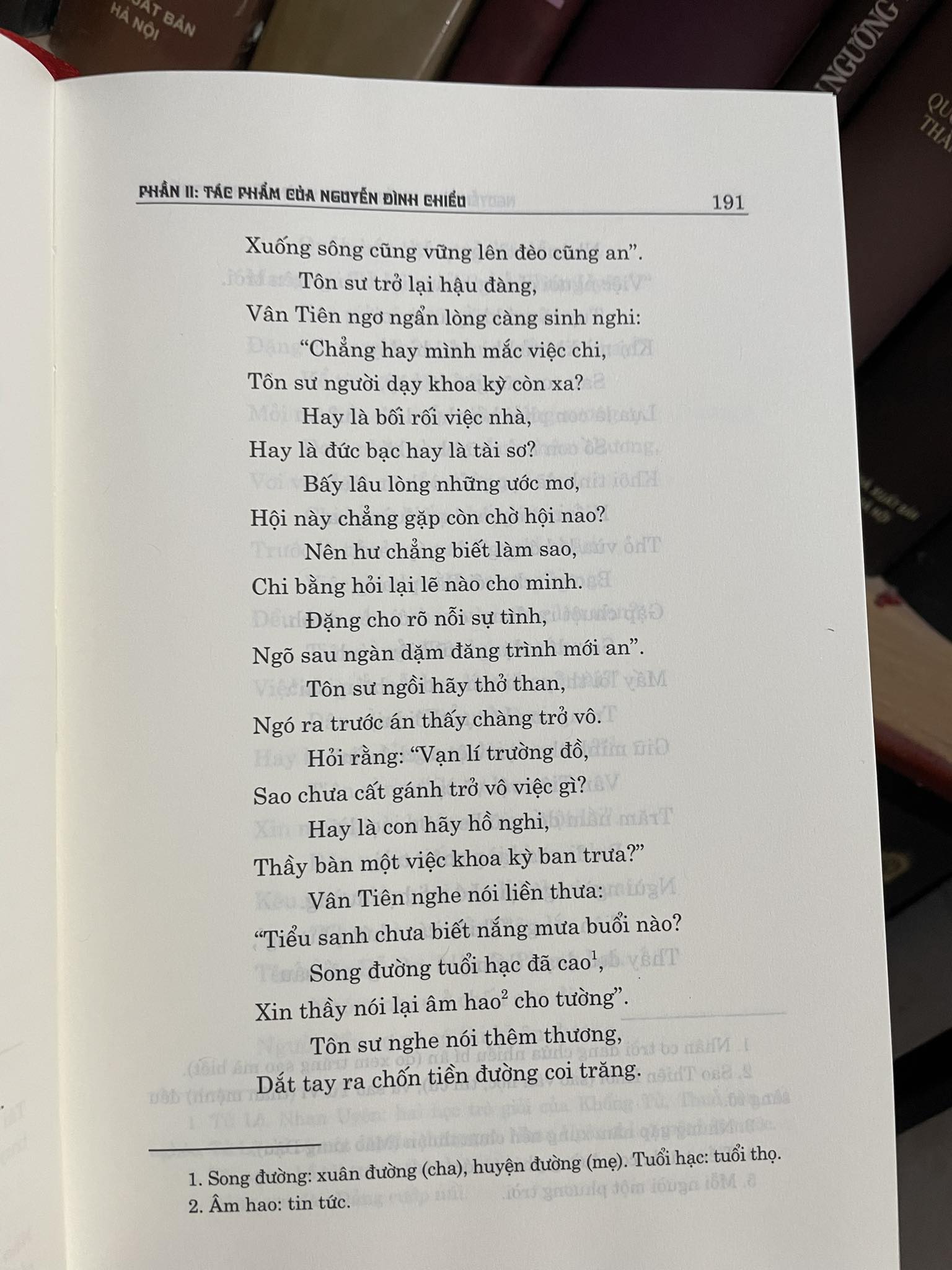 Phần II: Tác phẩm của Nguyễn Đình Chiểu (Do GS.TS. Nguyễn Chí Bền, PGS.TS. Lâm Nhân, PGS.TS. Phạm Lan Oanh, TS. Nguyễn Hoàng tuyển chọn). Chuyên luận của các tác giả in trong cuốn sách là một nghiên cứu tổng thể về cuộc đời của Nguyễn Đình Chiểu với những nét khái quát về bối cảnh lịch sử, xã hội và văn hóa; quê hương và gia đình; con người và sự nghiệp; nhà thơ, nhà văn hóa, vấn đề bảo vệ và phát huy di sản của Nguyễn Đình Chiểu. Cùng với chuyên luận, cuốn sách giới thiệu các tác phẩm của Nguyễn Đình Chiểu gồm: Lục Vân Tiên, Dương Từ - Hà Mậu, Ngư Tiều y thuật vấn đáp, các bài thơ, thơ điếu, văn tế.