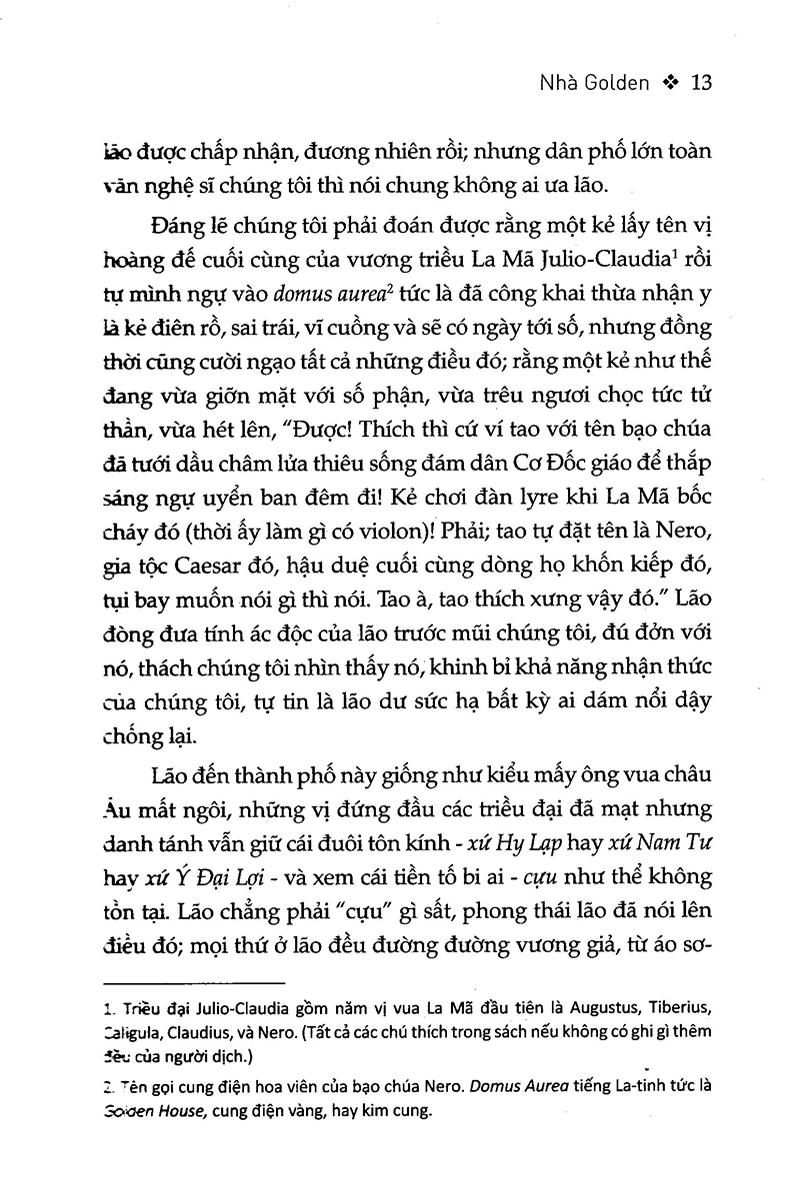 Cuộc tái hồi chủ nghĩa hiện thực đầy ngạo nghễ của Salman Rushdie được đánh dấu bằng “Nhà Golden” - một áng dụ ngôn bi tráng về nước Mỹ hiện đại. Lấy hai đầu mốc thời gian là thời điểm bắt đầu và kết thúc tám năm triều đại Obama, Nhà Golden xoay quanh số phận của bốn cha con từ vùng đất không được gọi tên đột ngột xuất hiện giữa trời New York một ngày định mệnh. Họ rũ bỏ quá khứ như rắn lột da, họ làm một phép biến hình như trong sử thi Ovid, và họ đâu ngờ chính họ là những kiến trúc sư cho cuộc sụp đổ của chính m.ình. Bằng thứ tiếng Anh khẩn trương và nóng rẫy như bầu không khí Ấn Độ quê hương, Rushdie đã đanh thép vạch mặt thiên đường tự do Mỹ trong cuộc khủng hoảng căn tính dai dẳng, trên nền bối cảnh náo động an ninh và tao loạn chính trị…