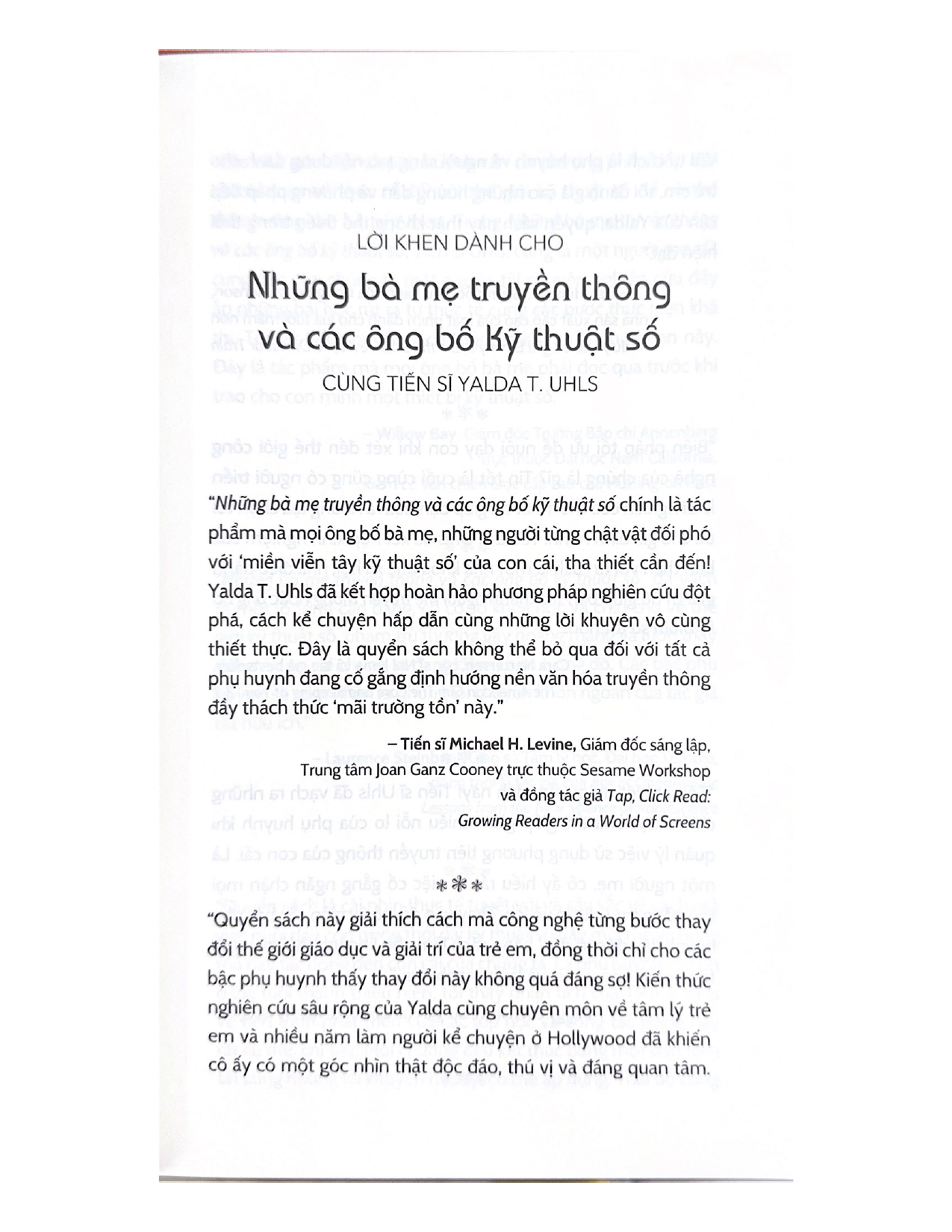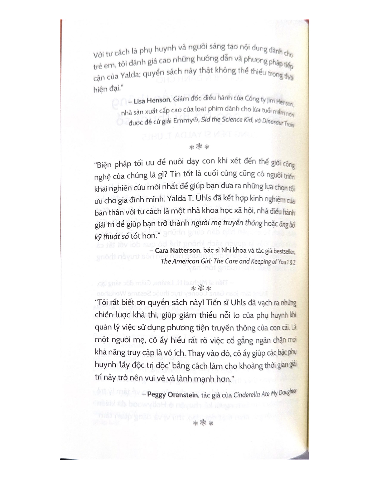 - Giới thiệu Những Bà Mẹ Truyền Thông Và Các Ông Bố Kỹ Thuật Số “Nhiều ông bố bà mẹ ngày nay cảm thấy sợ hãi trước những tin tức thời sự của giới truyền thông về “những mối nguy hiểm kỹ thuật số” như: bạo lực, tình dục và bắt nạt trực tuyến. Những bà mẹ truyền thông và các ông bố kỹ thuật số không chỉ “sửa chữa” nhiều lầm tưởng của phụ huynh về việc sử dụng Internet, mà còn giải thích sự thật về công nghệ kỹ thuật số một cách rõ ràng và dễ hiểu. Dựa trên các dữ kiện nghiên cứu, Tiến sĩ Uhls đã cung cấp bằng chứng giúp trấn an các bậc phụ huynh vượt qua nỗi sợ về việc phải nuôi dạy thành công những đứa trẻ ngoan trong thời đại kỹ thuật số. Đây là quyển sách “phải đọc” với những ai quan tâm đến sự thật và phương thức nuôi dạy con cái trong kỷ nguyên số này.”