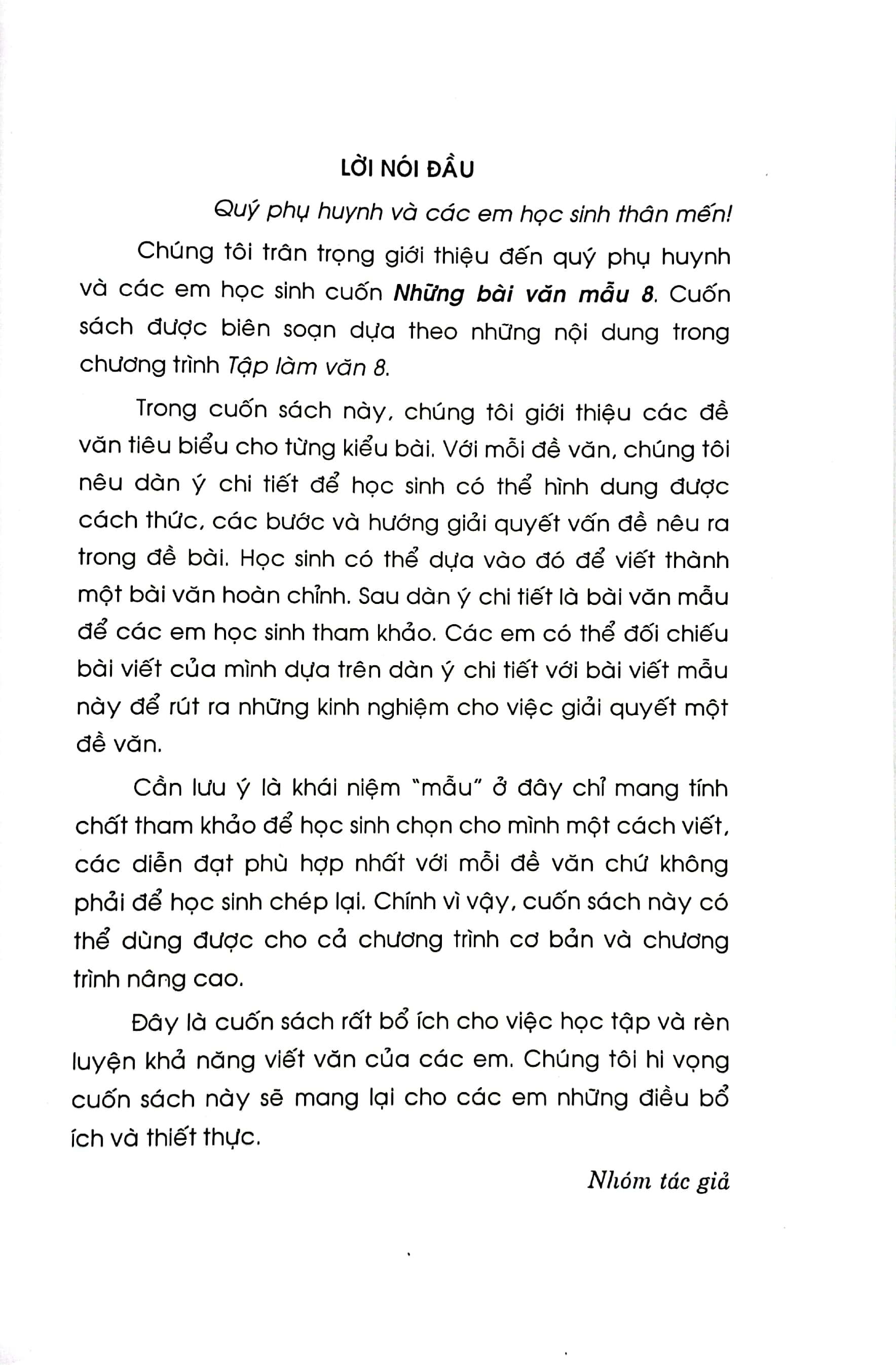 Mua tại TiktokNhững Bài Văn Mẫu 8 Cuốn sách tuyển chọn và giới thiệu đến các em những bài văn mẫu hay. Nội dung sách gồm bám sát chương trình Ngữ văn lớp 8 hiện hành. Các