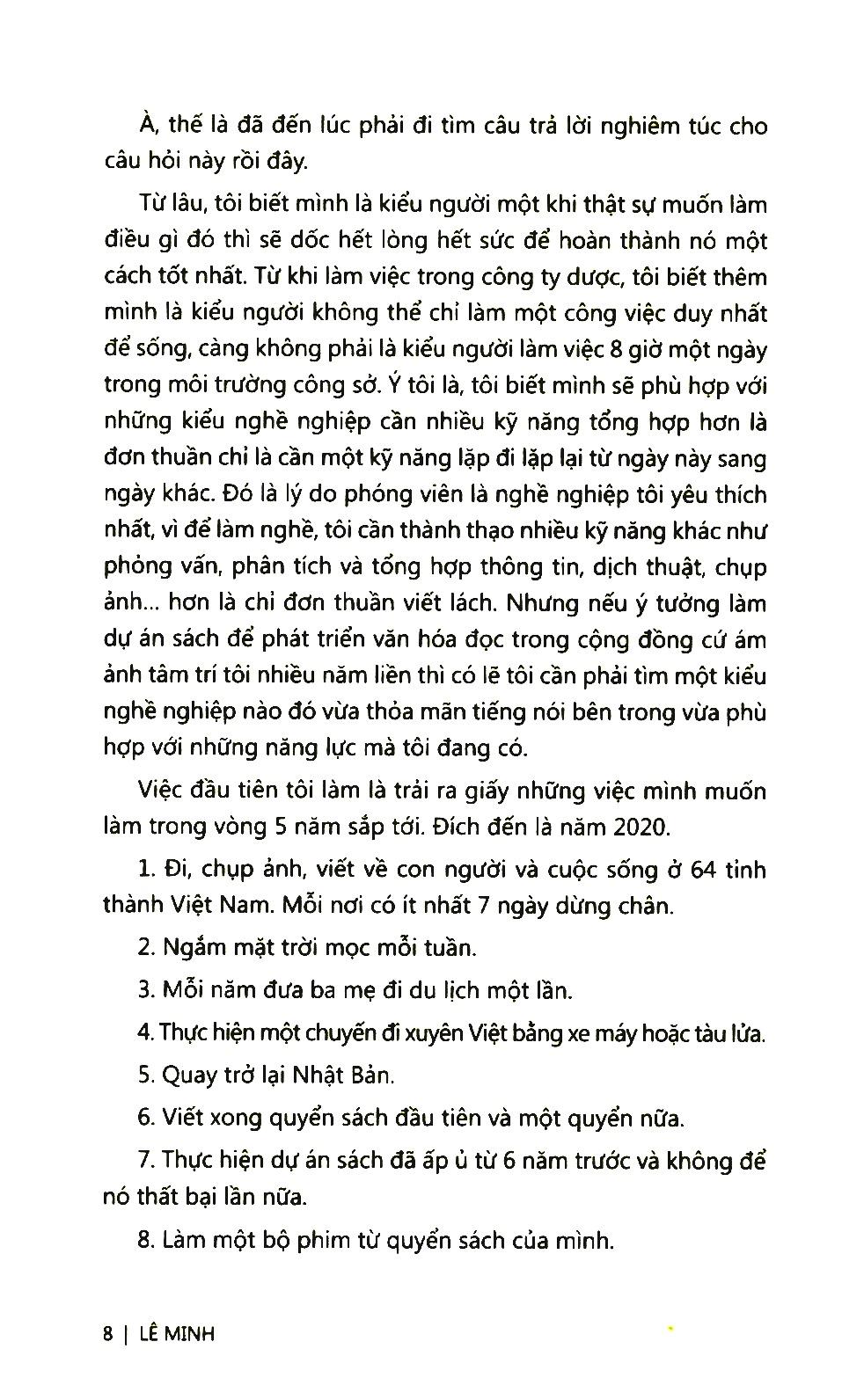 Suốt 8 năm theo đuổi con đường báo chí, không ai dạy cho chị khi nào nên dừng lại, khi nào khi nên rẽ trái, khi nào thì phải kiên nhẫn chịu đựng mà âm thầm bước đi, tất cả những gì chị học được đều nhờ những thử thách trên đường, những quyển sách đã đọc và một tiếng gọi từ bên trong. Nếu như chị em mình có thể chia sẻ với nhau nhiều bài học chung từ những quyển sách hay thì việc vượt qua thử thách trên mỗi con đường sẽ là thứ tài sản mà chỉ riêng mình ta có được. Tất cả những ý niệm “đúng đường”, “lạc đường”, “con đường dành cho ta” chỉ có thể được định nghĩa sau khi ta đã trải qua rất nhiều con đường. Tiếng gọi từ bên trong sẽ giúp em tìm ra bộ đáp án cho riêng mình”.