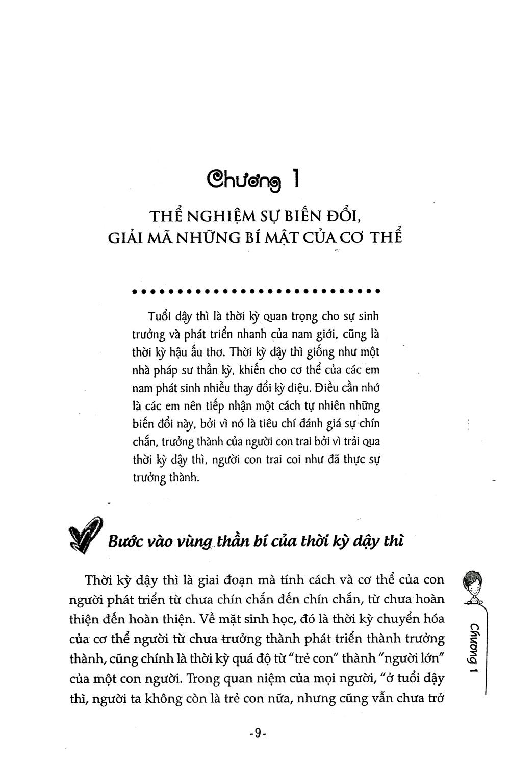 Thông qua việc phân tích những biến đổi về cơ thể, tâm sinh lý, tình cảm, kỹ năng giao tiếp, cuộc sống học tập và sinh hoạt ... của con trai ở lứa tuổi dậy thì, cuốn sách sẽ giải đáp những nghi ngờ, thắc mắc của con trai, đưa ra những lời khuyên để cha mẹ và con trai cùng tham khảo. Cuốn sách sẽ là người bạn tốt của con trai trong giai đoạn trưởng thành vô cùng quan trọng nhưng cũng đầy bất ổn, giúp con trai vượt qua tuổi dậy thì một cách thuận lợi, chuẩn bị đầy đủ sức lực và tinh thần để đón chào một tương lai tốt đẹp ở phía trước.