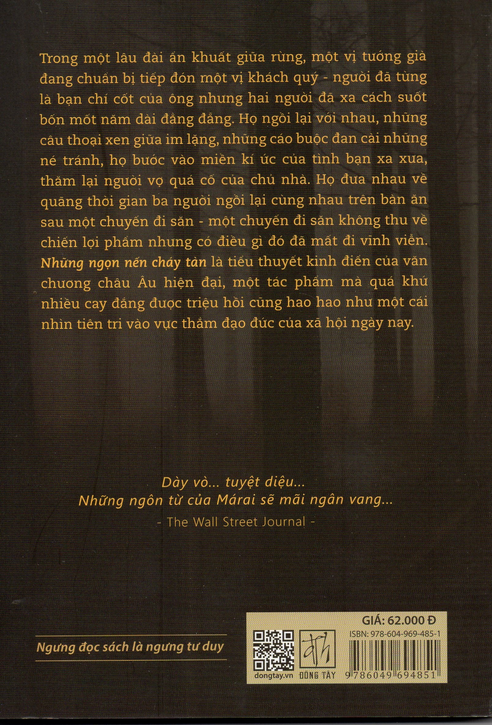 “Những ngọn nến cháy tàn” là một tiểu thuyết dày độ 200 trang. Cốt truyện giản dị, bó gọn trong ký ức của một ông tướng già (Henrik) qua một đêm chuyện trò với người bạn cũ (Konrád), người bạn thân thiết tưởng như liền ruột liền gan từ thời thơ ấu, thời tráng niên, cũng là người từng toan tính thủ tiêu ông trong một cảnh dàn dựng như một tai nạn, từng quyến rũ vợ ông và, trong một hoàn cảnh kỳ lạ, đã chạy trốn một cách hèn nhát đến một miền đất xa xôi. Sau hơn bốn thập kỷ, Konrád trở về. Cái đêm ấy rất có thể là lần cuối họ ngồi cùng nhau trong một khung cảnh quen thuộc mà chủ nhà đã cố tình sắp xếp, giữ mọi vật ở vị trí y nguyên như cách đó 41 năm. Những đồ vật vô tri nhưng chúng “cùng giữ một kỷ niệm, ý nghĩa của một phút giây” đã trôi qua trong đời hai con người - phút giây có thể coi là nút thắt cao trào của cuộc đời họ, là bước ngoặt khiến mỗi người mỗi ngả và phải âm thầm chịu đựng bi kịch của riêng mình trong suốt 41 năm.
