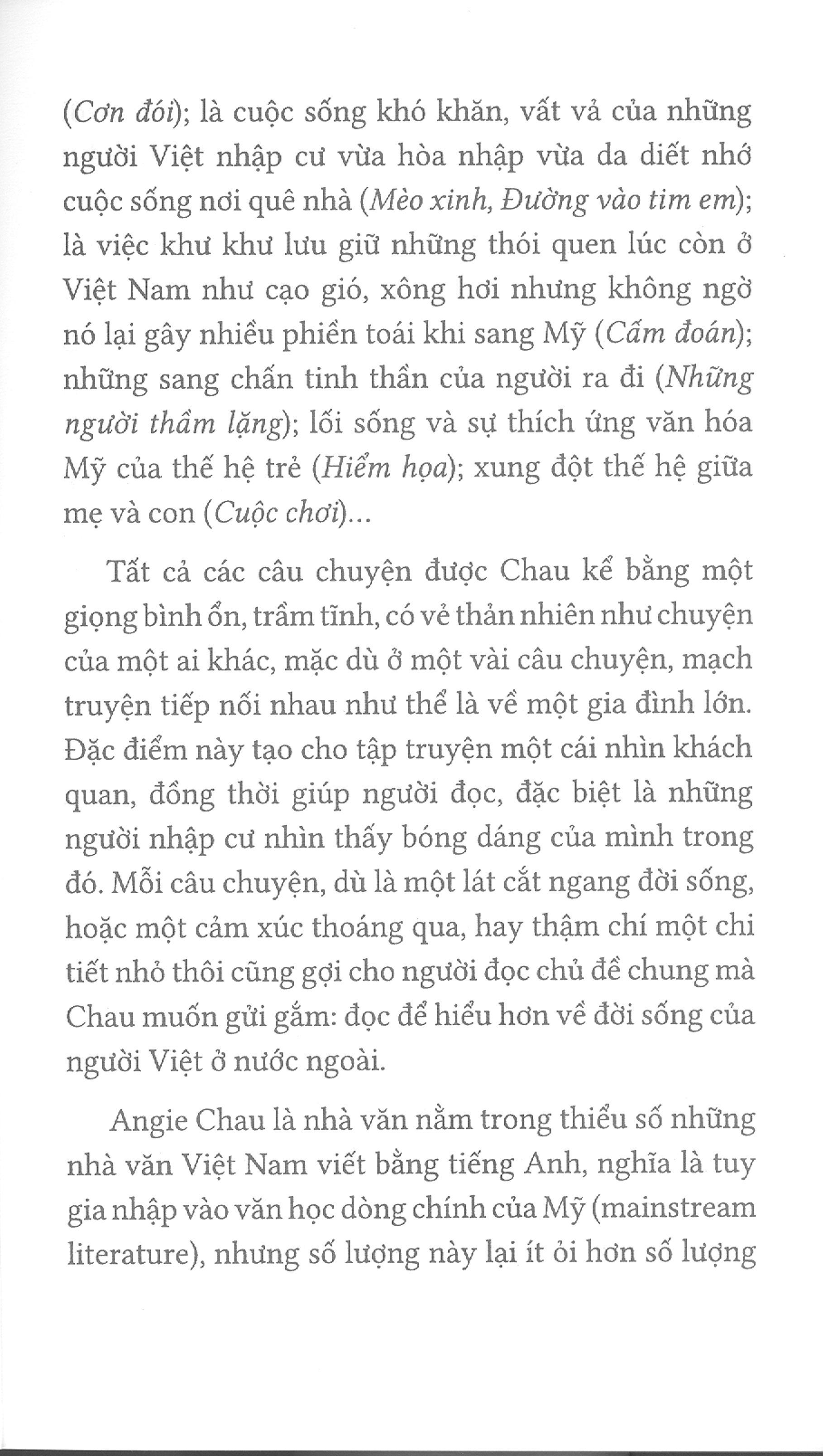 Tập truyện ngắn này của Angie Chau ra mắt như một phần của nỗ lực giới thiệu, tìm hiểu về cộng đồng Việt Nam định cư tại Hoa Kỳ nói riêng, và trên toàn thế giới nói chung" (PGS.TS. Trần Lê Hoa Tranh).