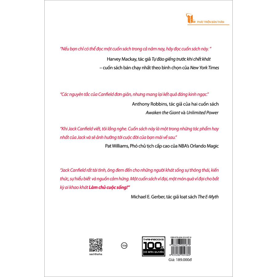 • Chủ động sử dụng mọi phương tiện giao tiếp để truyền cảm hứng, kích thích người khác. Hãy chú ý tới cảm giác của bạn khi thực hiện điều đó. Phần 5: Thành công và tiền bạcở phần này Tác giả sẽ chỉ ra cách thức phát triển nhận thức tích cực về tiền bạc, làm thế nào bạn đảm bảo đủ tiền để sống theo phong cách bạn mong muốn. Bạn đạt được những điều bạn tập trung vào: Chúng ta cần phải tập trung vào những vấn đề chúng ta mong muốn đạt được, nếu mong muốn giàu có chúng ta cần phải suy nghĩ đến nó và lên kế hoạch, đừng nghĩ đến có thể hay không, chỉ khi thực hiện và xem nó là trung tâm bạn mới có thể tìm ra con đường chinh phục nó. “Nếu bạn không muốn coi trọng và kiếm tìm sự giàu có, bạn sẽ gần như không trở nên giàu có được. Bạn cần tìm kiếm sự thịnh vượng thì nó mới tìm kiếm bạn. Nếu bạn không có ước mơ làm giàu cháy bỏng, bạn sẽ không bao giờ giàu có được. Để làm giàu bạn cần xác định mục tiêu giàu có thật rõ ràng.” Làm chủ trò chơi tiêu dùng: “Có quá nhiều người tiêu xài các khoản tiền họ không làm ra để mua những vật dụng họ không muốn để gây ấn tượng với những người họ không ưa”. Mình nghĩ điều này là không cần thiết vì chỉ khi bạn đã đi làm kiếm ra tiền bạn mới có thể hiểu được giá trị khi kiếm những đồng tiền đó, nó không hề dễ dàng. Và tiền cũng không phải là vô hạn, chúng ta cần chi tiêu hợp lý vào các vấn đề cần thiết trong cuộc sống. Nếu muốn chi tiêu nhiều tiền thì bạn cần phải làm ra nhiều tiền. Phần 6: Thành công bắt đầu ngay từ thời điểm này phần này nói về tầm quan trọng của việc bắt tay thực hiện ngay bây giờ và khuyến khích mọi người cùng tham gia. Hãy bắt tay hành động ngay từ bây giờ: Ngay bây giờ hoặc không bao giờ, không bao giờ là quá muộn để bạn bắt đầu một cuộc hành trình. Hãy sắp xếp thời gian thật hợp lý, đề ra mục tiêu, kế hoạch để chinh phục cuộc sống mà bạn mơ ước. Tự tạo cho mình suy nghĩ tích cực làm động lực để hoàn thành công việc một cách tốt nhất. Thế giới này chính là những gì bạn nghĩ về nó. Thành công không còn là một bí mật nhưng bạn phải là người làm chủ chính mình, cố gắng tiến về phía trước. Tác giả: Jack Canfield là một diễn thuyết gia nổi tiếng, tốt nghiệp đại học Harvard, nhận bằng cao học của Đại học Massachusetts và học vị tiến sĩ của đại học Santa Monica. Năm 1973, ông được tổ chức Jaycees vinh danh là một trong mười người đàn ông xuất chúng của nước Mỹ.