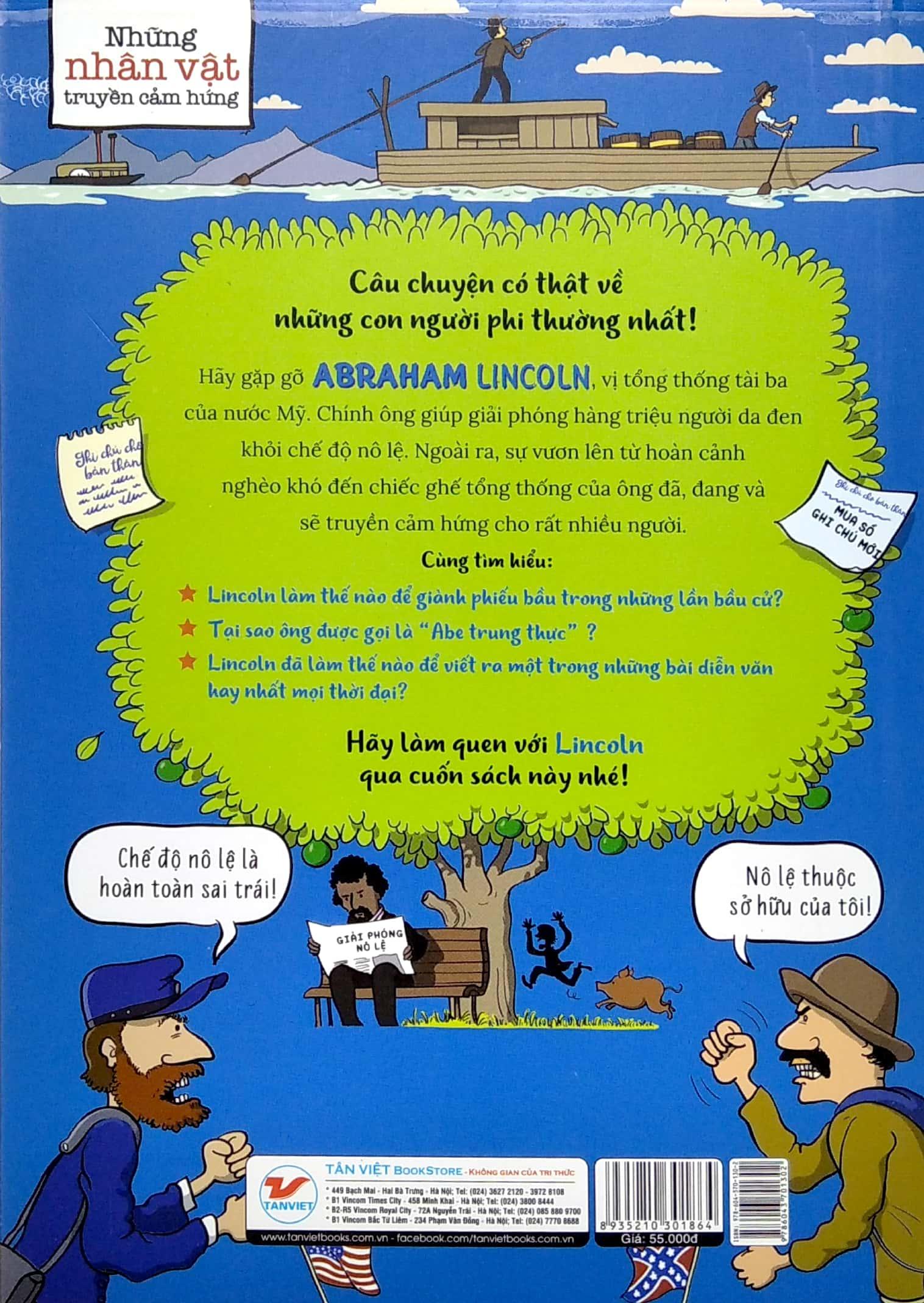 Abraham Lincoln là vị tổng thống tài ba của nước Mỹ. Chính ông đã lèo lái đưa đất nước thoát khỏi cuộc Nội chiến, thành công trong việc bảo vệ Liên bang, cũng như giúp giải phóng hàng triệu người da đen khỏi chế độ nô lệ. Lincoln được nhớ đến như là một vị anh hùng dân tộc và luôn nằm trong danh sách các tổng thống vĩ đại nhất trong lịch sử Mỹ. Trong quá trình vươn lên từ hoàn cảnh nghèo khó đến chiếc ghế tổng thống, ông đã phải vượt qua rất nhiều khó khăn, trở ngại. Vậy làm thế nào để Lincoln giành phiếu bầu trong những lần bầu cử? Tại sao ông được gọi là “Abe trung thực”? Ông đã làm thế nào để viết ra một trong những bài diễn văn hay nhất mọi thời đại? Hãy làm quen với Lincoln qua cuốn sách này nhé!