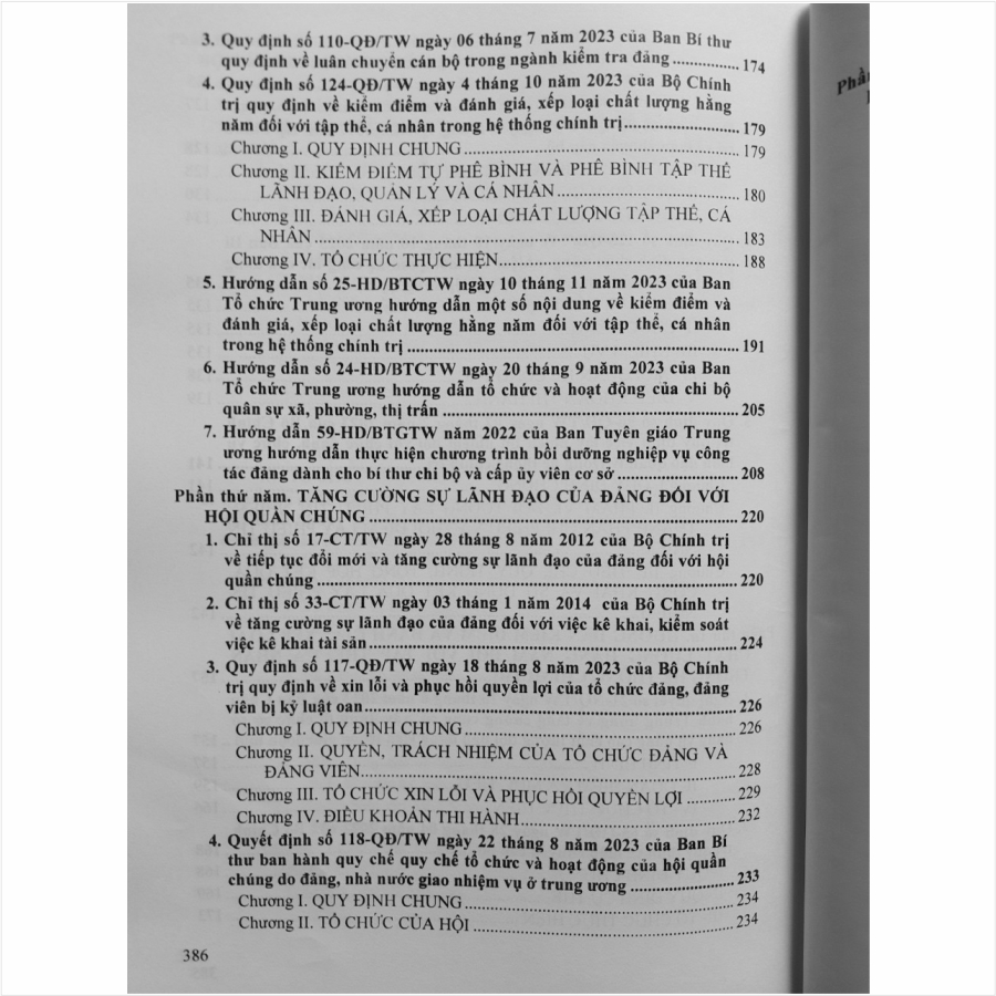 Ngày 11 tháng 7 năm 2023, Bộ Chính trị ban hành Quy định số 114-QĐ/TW quy định về kiểm soát quyền lực và phòng, chống tham nhũng, tiêu cực trong công tác cán bộ, Quy định số 131-QĐ/TW ngày 27 tháng 10 năm 2023 của Ban Chấp hành Trung ương về kiểm soát quyền lực, phòng, chống tham nhũng, tiêu cực trong công tác kiểm tra, giám sát, thi hành kỷ luật đảng và trong hoạt động thanh tra, kiểm toán, Quy định số 132-QĐ/TW ngày 27 tháng 10 năm 2023 của Ban Chấp hành Trung ương về kiểm soát quyền lực, phòng, chống tham nhũng, tiêu cực trong hoạt động điều tra, truy tố, xét xử, thi hành án, Hướng dẫn số 25-HD/BTCTW ngày 10 tháng 11 năm 2023 của Ban Tổ chức Trung ương nội dung về kiểm điểm và đánh giả, xếp loại chất lượng hằng năm đối với tập thể, cá nhân trong hệ thống chính trị và nhiều văn bản liên quan.