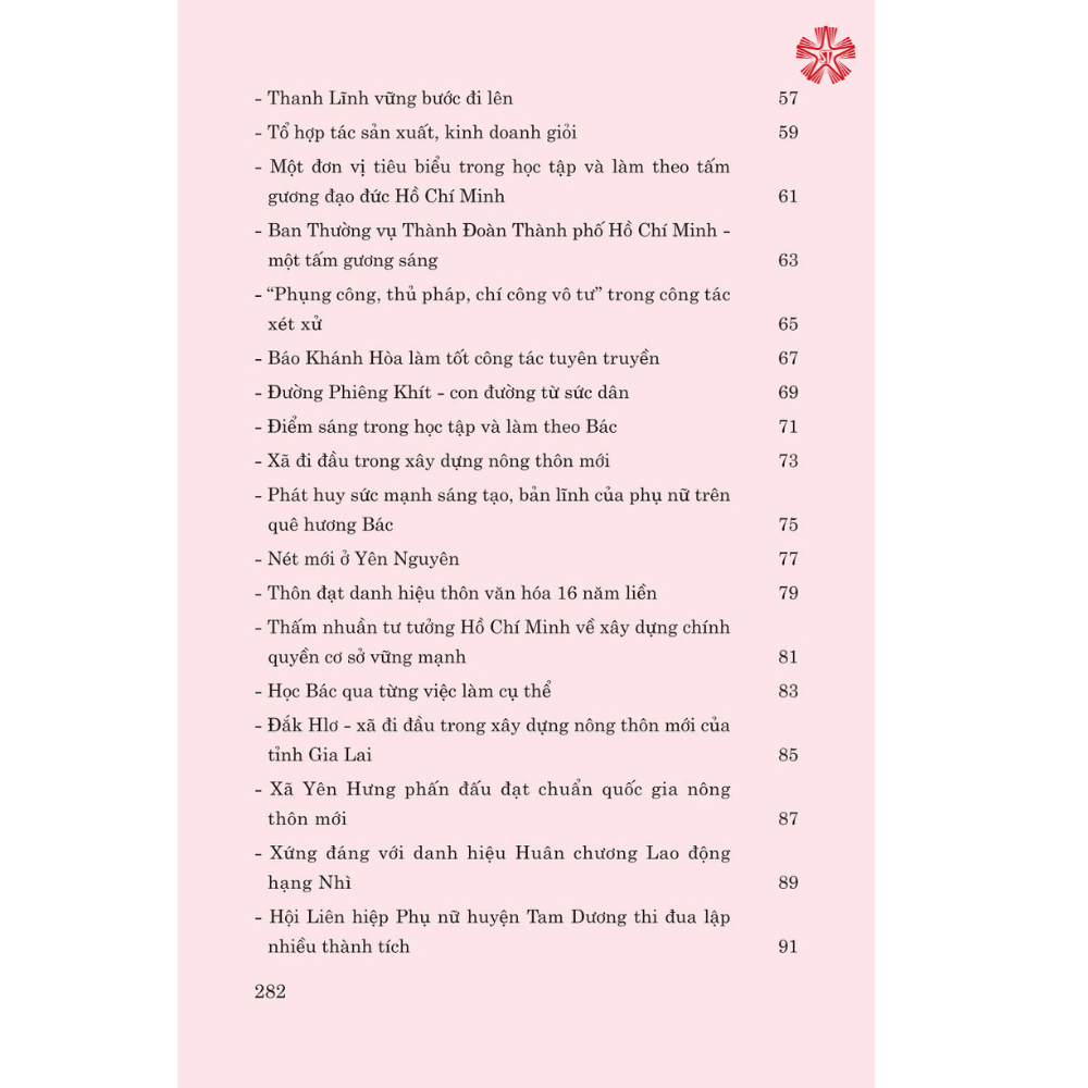 Cuốn sách là tập hợp một số chỉ thị, nghị quyết, kế hoạch về học tập và làm theo tấm gương đạo đức Hồ Chí Minh. Giới thiệu các tấm gương tập thể, cá nhân điển hình trong các lĩnh vực xây dựng và phát triển kinh tế, văn hoá - xã hội, xây dựng Đảng, an ninh - quốc phòng trong phong trào học tập và làm theo tấm gương đạo đức Hồ Chí Minh.
