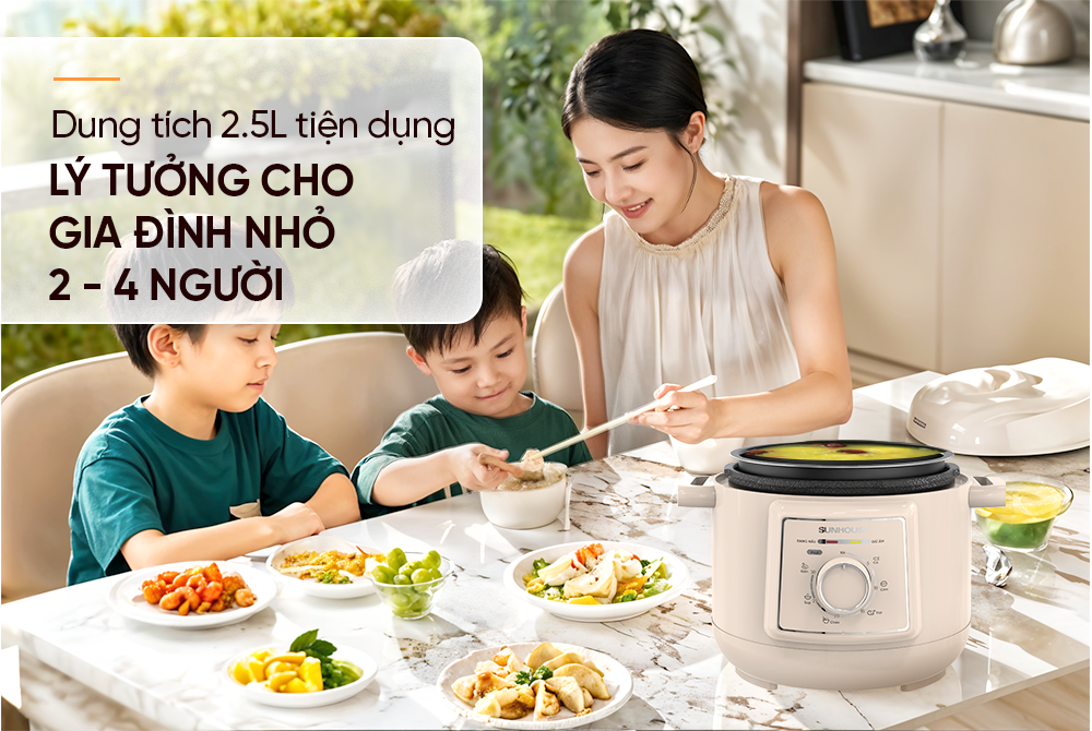 Nồi áp suất đa năng 2.5L SUNHOUSE SHD1520 là trợ thủ nhà bếp hiện đại dành cho những ai yêu thích sự tiện lợi mà vẫn đề cao dinh dưỡng. Với thiết kế gọn nhẹ, dung tích vừa đủ 2.5L cùng công suất mạnh mẽ, sản phẩm giúp bạn chế biến nhanh chóng đa dạng món ăn: từ ninh xương, hầm canh đến nấu cháo, nấu cơm,... Cơ chế nấu áp suất giúp thực phẩm chín mềm trong thời gian ngắn nhưng vẫn giữ nguyên dưỡng chất và hương vị, đáp ứng trọn vẹn cả nhu cầu ngon miệng lẫn tốt cho sức khỏe. Thiết kế nhỏ gọn, dễ sử dụng trong mọi không gian bếp Nồi áp suất đa năng 2.5L Sunhouse SHD1520 sở hữu kiểu dáng gọn nhẹ, tay cầm chắc chắn, thuận tiện khi di chuyển và bảo quản. Giao diện điều khiển đơn giản, dễ thao tác với núm xoay, phù hợp với nhiều đối tượng sử dụng - từ người lớn tuổi đến các bạn trẻ sống độc thân hoặc gia đình nhỏ. Dung tích 2.5L - Đa dạng món ăn Với dung tích 2.5L, sản phẩm đáp ứng tốt nhu cầu nấu ăn hằng ngày như nấu cơm, cháo, súp hay hầm xương cho 2 - 4 người. Đây là lựa chọn lý tưởng cho các gia đình ít người hoặc người dùng yêu thích thiết bị nhỏ gọn, tiện lợi mà vẫn đa năng. Lòng nồi dày 1.8mm - Giữ nhiệt tốt, bền bỉ dài lâu Lòng nồi cấu tạo từ hợp kim nhôm cao cấp, dày đến 1.8mm, giúp truyền và giữ nhiệt ổn định trong suốt quá trình nấu. Nhờ đó, thực phẩm chín đều, giữ nguyên vị ngon, đồng thời nồi có độ bền cao, dễ vệ sinh sau khi sử dụng. Xả áp bằng nút ấn an toàn tuyệt đối Nồi hoạt động với công suất mạnh mẽ giúp rút ngắn thời gian nấu, nhất là khi chế biến các món cần hầm lâu như cháo xương, súp gà hay canh thịt. Tính năng xả áp bằng nút ấn tiện lợi giúp giải phóng hơi an toàn, ngăn ngừa tình trạng bỏng hơi khi mở nắp, đảm bảo an tâm tuyệt đối cho người nội trợ.