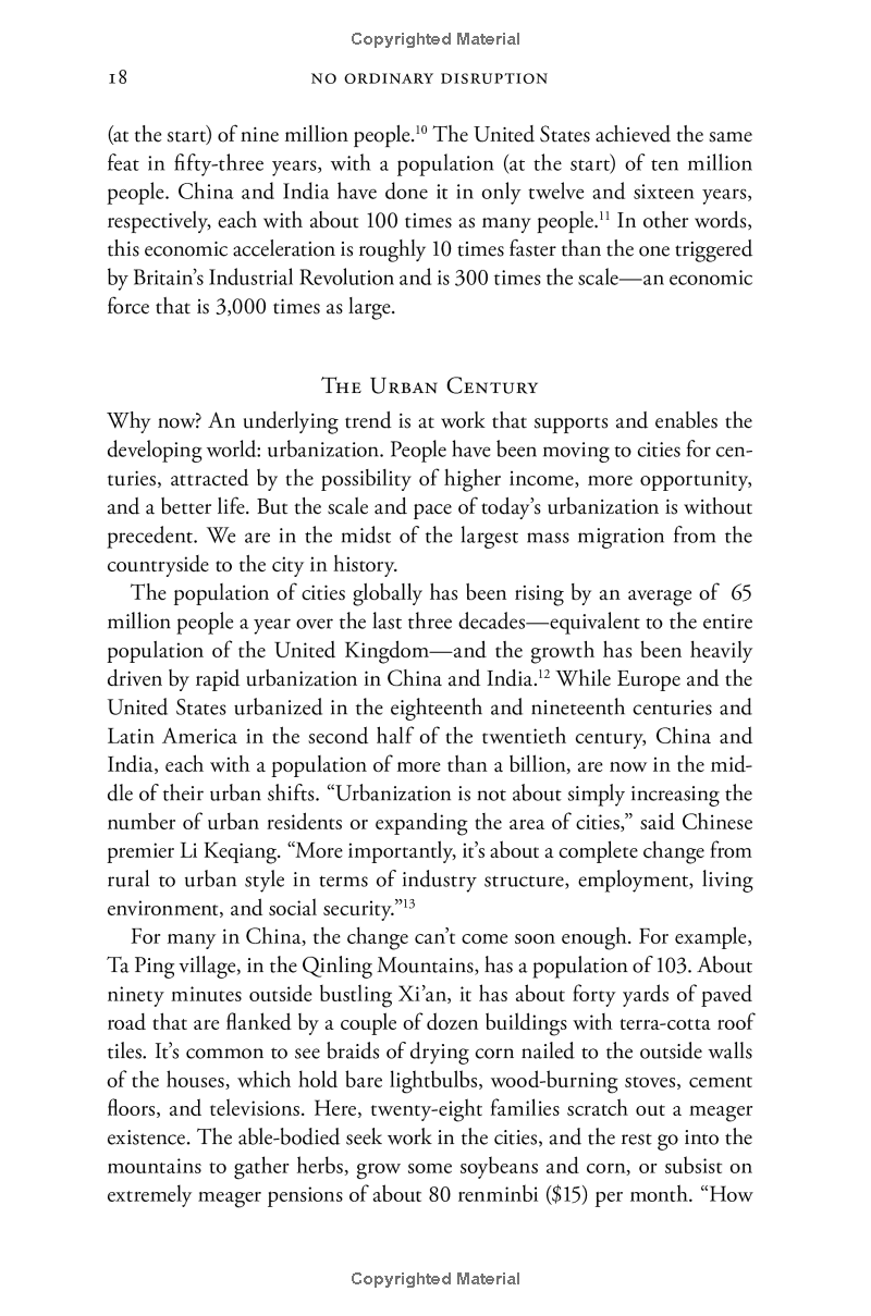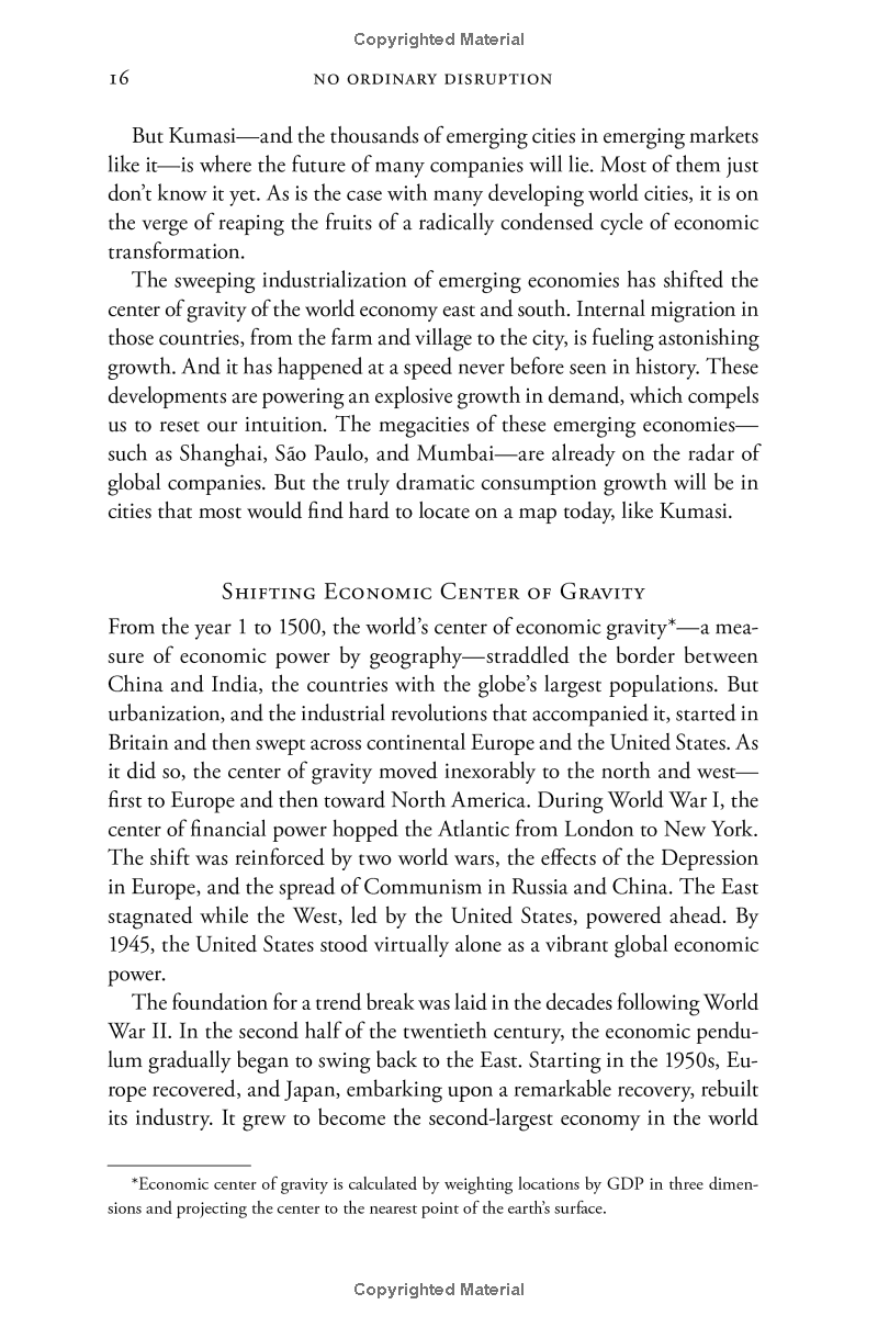 What sets No Ordinary Disruption apart is depth of analysis combined with lively writing informed by surprising, memorable insights that enable us to quickly grasp the disruptive forces at work. For evidence of the shift to emerging markets, consider the startling fact that, by 2025, a single regional city in China -- Tianjin -- will have a GDP equal to that of the Sweden, of that, in the decades ahead, half of the world's economic growth will come from 440 cities including Kumasi in Ghana or Santa Carina in Brazil that most executives today would be hard-pressed to locate on a map.