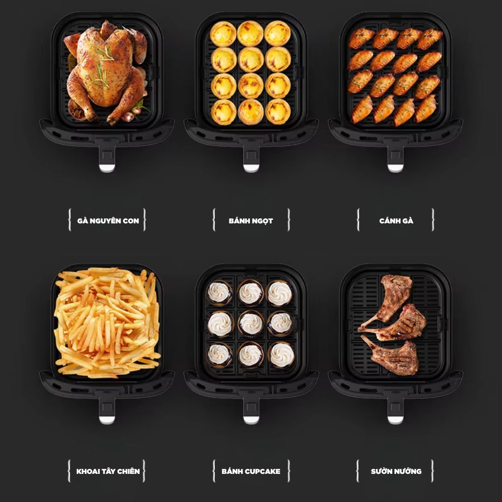 THÔNG SỐ KỸ THUẬT : - Dung tích rổ chiên 5.5L - Dung tích nồi chiên 7L - Bảng điều khiển Cảm ứng/ chạm - Ngôn ngữ Tiếng Việt - Điện áp 220-240V 50/60Hz - Công suất 1600W - Màu sắc Xám - Hiển thị Đèn Led trắng - Lớp phủ rổ bên trong/ ngoài Có - Lớp phủ nồi trong / ngoài Có - Thực đơn tự động 8 (Khoai tây chiên, Bít tết, Rau xanh, Gà, Bánh nướng, Cá, Đồ đông lạnh, Pizza) -