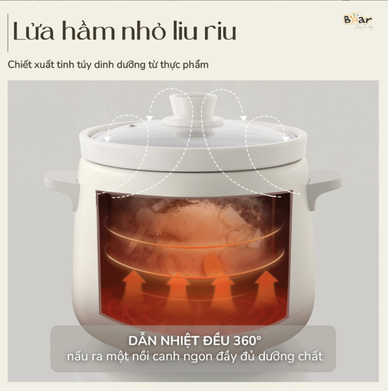 - Giữ ấm thức ăn: Ngay cả khi bạn đã ngắt kết nối với nguồn điện, chiếc nồi nấu chậm Bear vẫn có thể giữ ấm món ăn trong vòng 8 tiếng. Nắp nồi được làm từ chất liệu gốm với thiết kế khóa chặt, giúp món ăn luôn giữ được độ ẩm và hàm lượng chất dinh dưỡng vốn có.