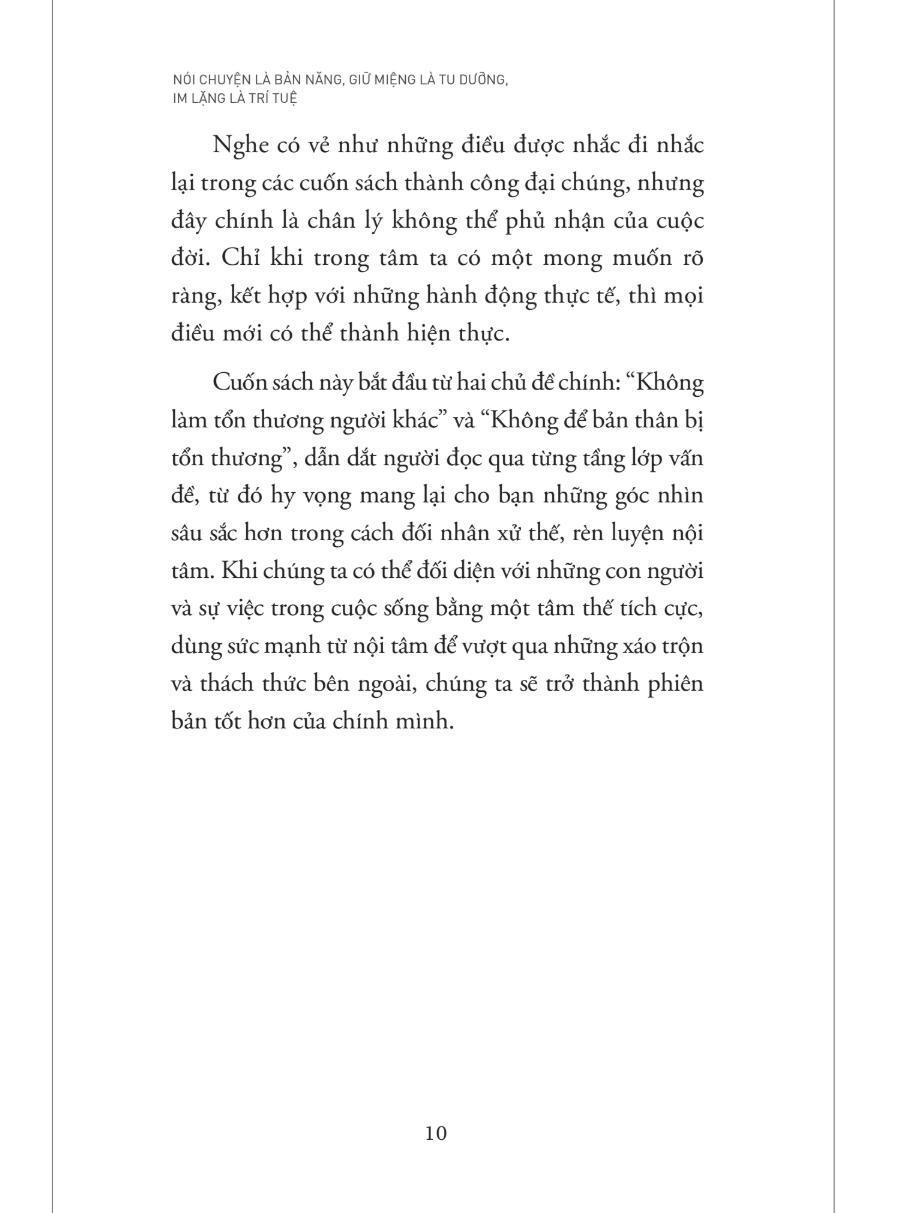"Nói chuyện là bản năng, giữ miệng là tu dưỡng, im lặng là trí tuệ" không chỉ giúp bạn giao tiếp tốt hơn, mà còn hướng tới một phiên bản trưởng thành và lành mạnh hơn của chính mình – một người biết thấu hiểu, biết yêu thương và đủ mạnh mẽ để không làm tổn thương cũng như không để bị tổn thương.