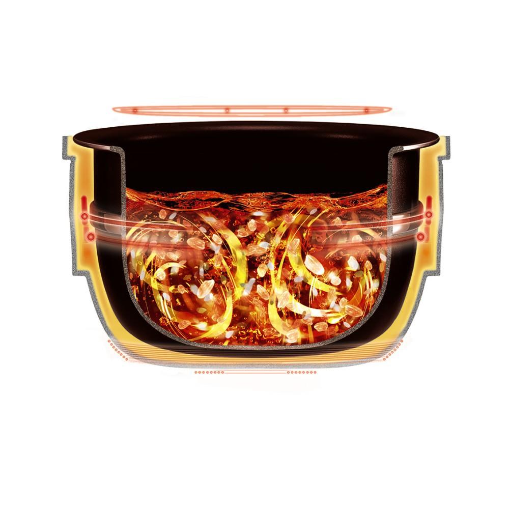 Lòng nồi tráng nhiều lớp hợp kim ép dọc rất dày dặn và bền Mâm nấu từ với công suất là 1455W Màn hình điện tử thông minh có nhiều chế độ: nấu cơm, cháo,