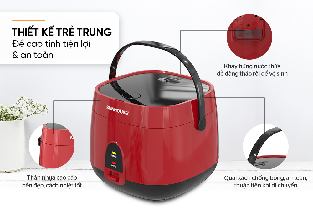 Nồi cơm điện SUNHOUSE 1.8L SHD8602 KIỂU DÁNG TRẺ TRUNG – TIỆN DỤNG VÀ AN TOÀN Thiết kế đơn giản, trẻ trung và an toàn Nồi cơm điện SUNHOUSE 1.8L SHD8602 được thiết kế với