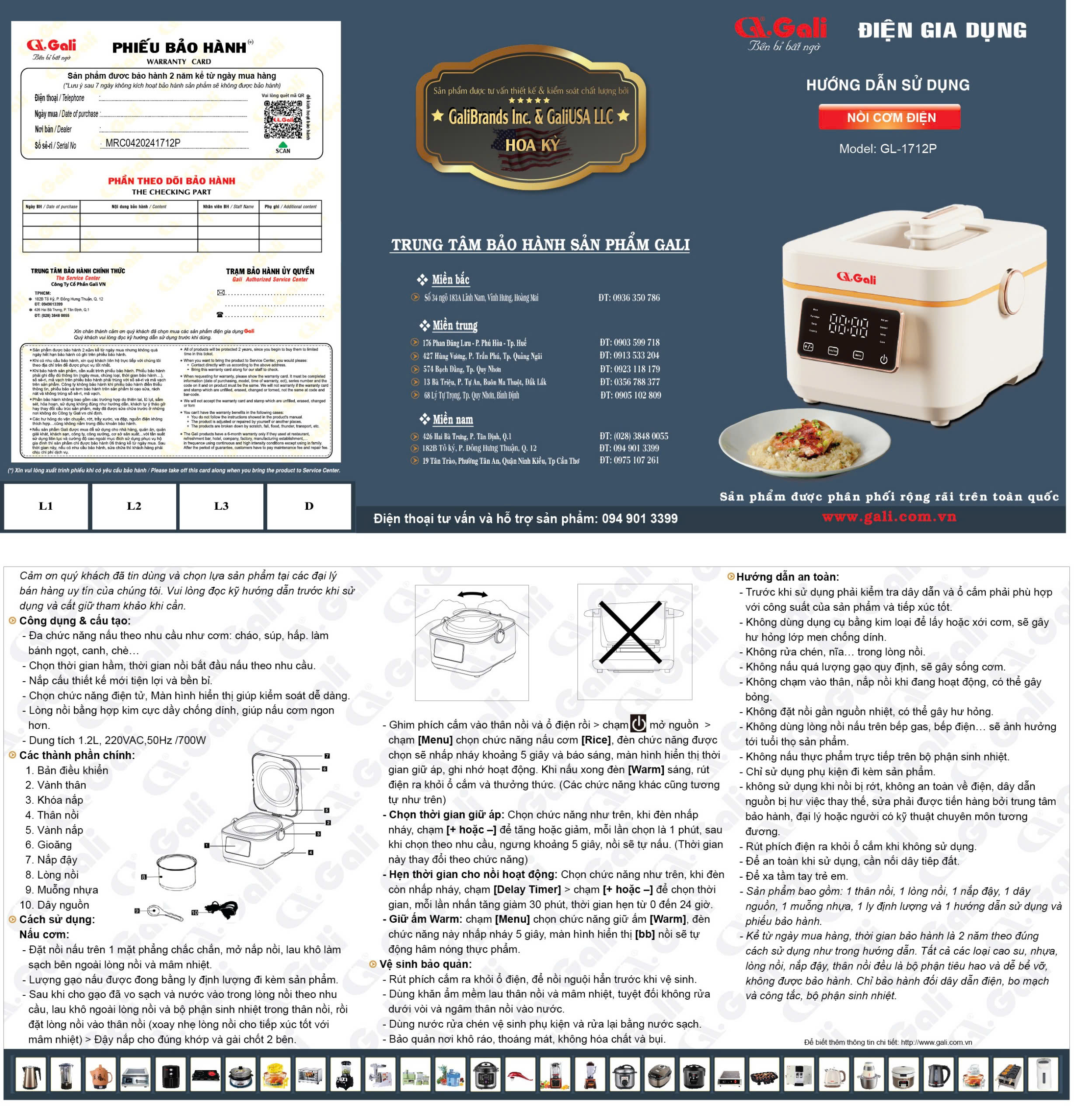 Nồi cơm điện Gali GL-1712P Dung tích 1.2L. Thiết kế đa chức năng nấu, nhỏ gọn, nắp có thể tháo rời. Lòng nồi siêu dày, giữ nhiệt tốt. Hàng chính hãng bảo hành 24 tháng