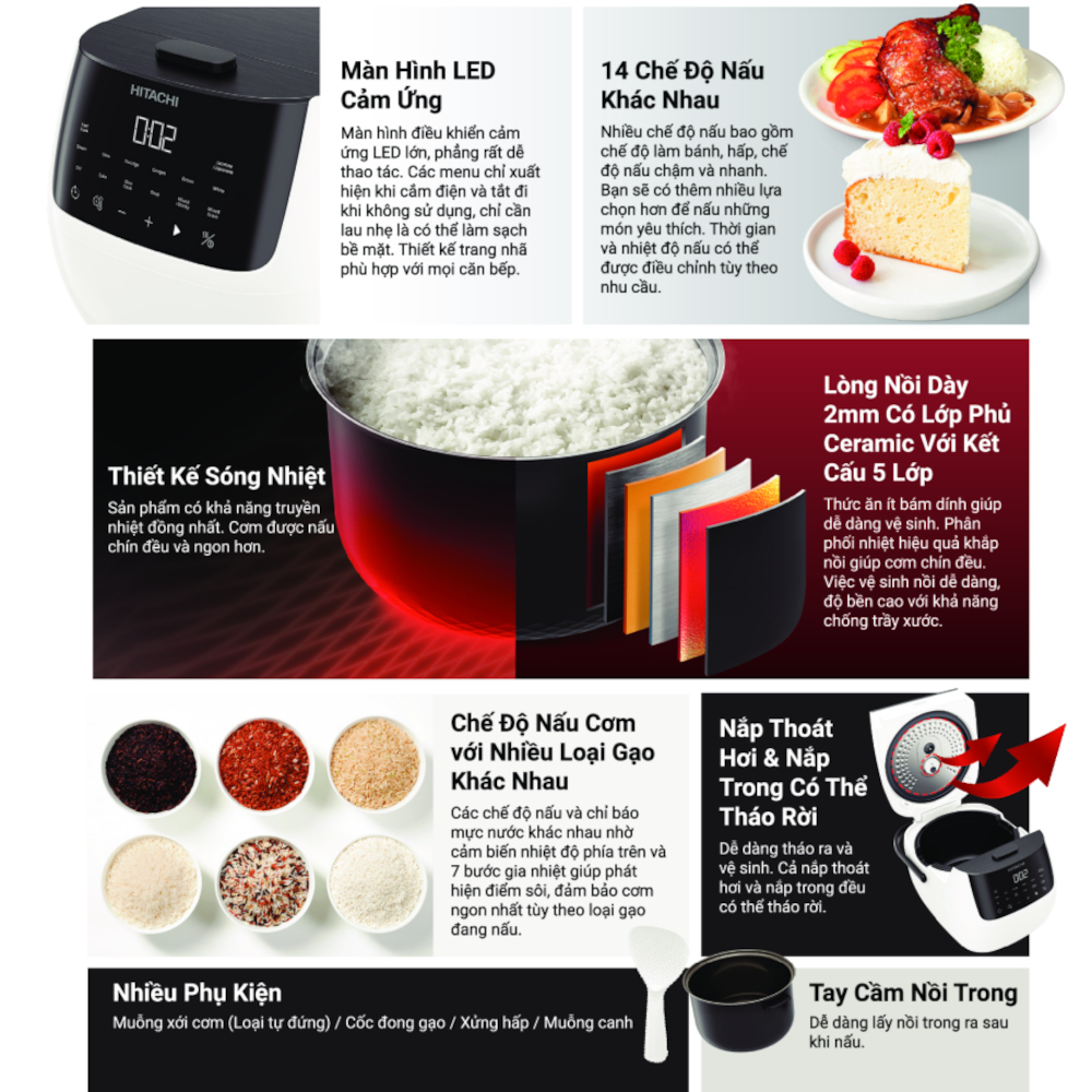 Nồi cơm điện tử Hitachi 1.8 lít RZ-S18VN với thiết kế nhỏ gọn, sang trọng cùng 16 chương trình nấu nướng khác nhau phục vụ tốt cho công việc nội trợ chắc chắn sẽ mang đến sự hài lòng cho mọi nhà.