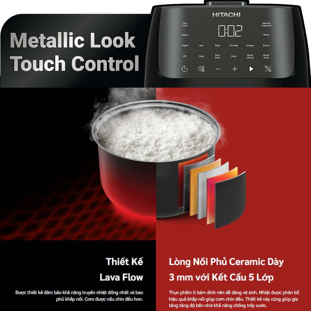 Nồi cơm điện tử Hitachi RZ-S18VN sử dụng công nghệ 3D là công nghệ gia hiện đại cho lượng nhiệt tỏa đều từ trên xuống dưới và từ dưới lên được áp dụng cho nồi cơm điện tạo ra nhiệt bên trong nồi, giúp nấu cơm nhanh hơn đồng thời duy trì được hương vị và chất lượng của cơm.