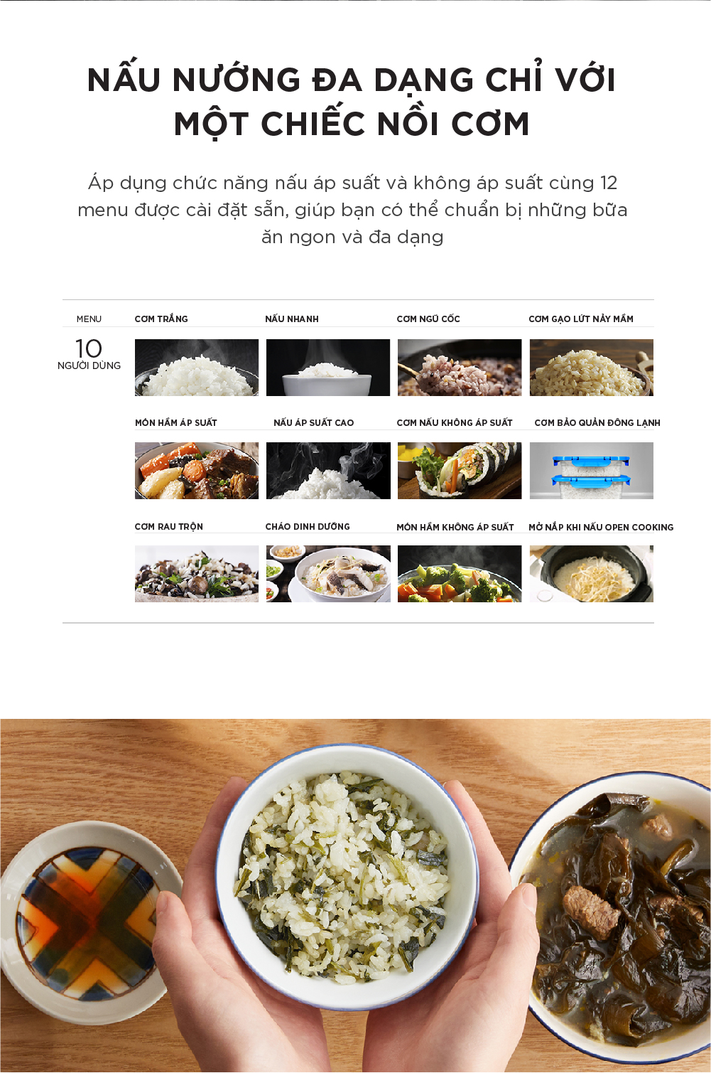 MENU ĐA NĂNG: • Chức năng nấu dinh dưỡng: Qunioa, Steel Cut Oatmeal, Brown, GABA Brown, Steam • Chức năng nấu cơm theo từng loại gạo: Long & Short Grain White, Premium, Congee(Thick & Thin),