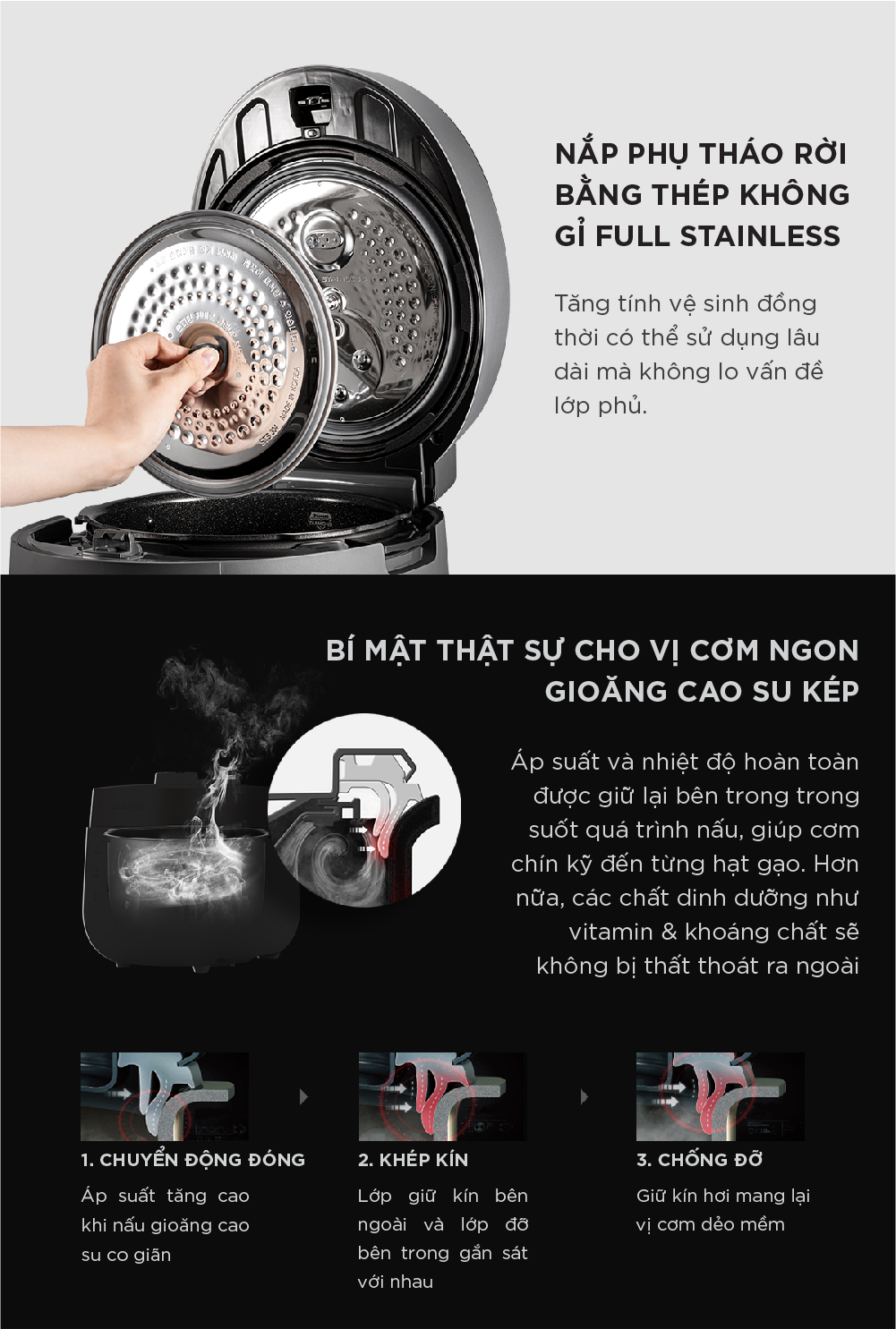 - Áp suất cực cao (2atm) - Chức năng nấu ăn mở - Mở nắp chuyển động an toàn 2 nấc - Nắp phụ không gỉ có thể tháo rời - Chức năng tiết kiệm