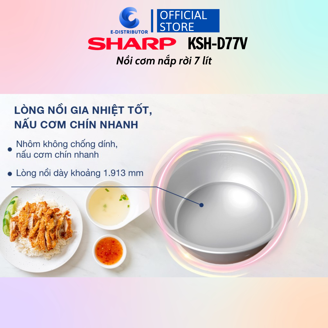 Nồi cơm nắp rời Sharp 7 lít KSH-D77V là giải pháp hiệu quả giúp nấu cơm số lượng nhiều và muốn cơm chín nhanh, phù hợp cho những gia đình đông người hay quán cơm, nhà hàng,...