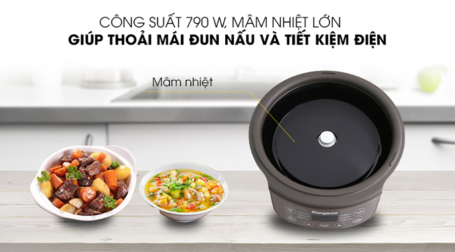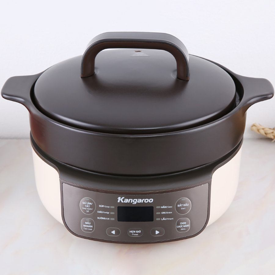 Nồi hầm dưỡng sinh Kangaroo KG3SC1 có tới 8 công dụng nấu Với 8 chế độ: Nấu nhanh (Fast cook); Súp (Soup); Cháo (Porridge); Nướng (Grill); Hầm (Stew); Om (Braise); Lẩu (Hot pot); Giữ ấm ( Keep Warm ). Rất nhiều món ăn có thể sử dụng chỉ với chiếc Nồi hầm dưỡng sinh KG3SC1 này. Mỗi chế độ nấu được thiết kế có thể cài đặt hẹn giờ, giúp người nấu nướng có thể điều chỉnh linh hoạt phù hợp với từng món ăn. Thực sự rảnh tay và có nhiều thời gian hơn cho con cái hoặc nghỉ ngơi. Lòng nồi thiết kế dày dặn với công nghệ chống dính Ceramic tiên tiến nhất Sự đặc biệt của nồi hầm dưỡng sinh đó là lòng nồi được thiết kế dày, cộng với công nghệ chống dính Ceramic. Điều đó giúp cho các món ăn cần nấu lâu như: cháo, ninh hầm, om…chuẩn vị như nấu nồi đất ngày xưa. Bởi nhiệt vừa đủ, đồ ăn được ninh chín một cách từ từ, mềm nhưng không bị nát. Công nghệ chống dính Ceramic là công nghệ chống dính mới. Có lẽ bạn không chỉ một lần nghe đến chống dính Ceramic với lời khen về độ lành mạnh và thân thiện với môi trường hơn so với chống dính thông thường Lòng nồi thiết kế dày dặn và chống dính Ceramic cao cấp Về mặt kỹ thuật, “Ceramic” có nghĩa là “đất sét được nung cứng”. Vì vậy, khi nói đến Ceramic, đó là  kim loại được phủ một lớp chống dính làm từ khoáng chất vô cơ. Ceramic được quảng cáo là dụng cụ nấu nướng “xanh”. Đây là một sự thay đổi gần đây trong xu hướng sử dụng dụng cụ chống dính từ năm 1960. Chống dính Ceramic có bề mặt được phủ men gốm – không độc hại, cần ít dầu và chất béo hơn khi nấu nướng. Nồi hầm dưỡng sinh dung tích 3L thoải mái ninh nấu Dung tích lòng nồi lên tới 3L có thể thoải mái nấu nướng các món hầm chim, gà tần, soup…cho cả gia đình. Hẹn giờ tự động ngắt nghỉ Với 8 chế độ nấu, tương ứng với mỗi chế độ nấu có thời gian phù hợp. Sau khi kết thúc chế độ nấu, nồi sẽ chuyển về chế độ giữ ấm giúp an toàn nấu nướng. Không lo cháy khét. Đặc biệt đồ ăn luôn được giữ ấm mà rất tiết kiệm điện năng. Thiết kế tay cầm chống bỏng Tay cầm được thiết kế chống bỏng, giúp cho an toàn trong sử dụng. Đó cũng là xu hướng thiết kế các thiết bị nấu nướng ngày nay. Hạn chế hoặc không cần phải sử dụng tới găng bắc bếp. Công suất tiết kiệm điện 790W Với công suất này, cuối tháng tiền điện không còn là nỗi lo đối với gia đình bạn. Thoải mái đun nấu những món ăn ưa thích. Vừa ngon lại vừa tiết kiệm. Chắc chắn là một sự lựa chọn không thể bỏ qua cho mỗi gia đình.