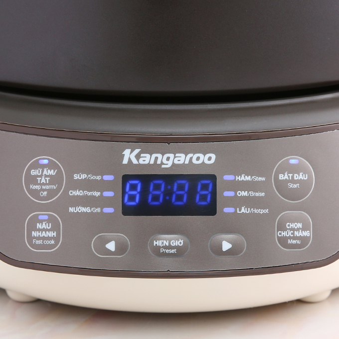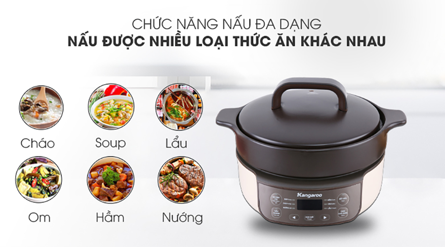 Nồi hầm dưỡng sinh Kangaroo KG3SC1 có tới 8 công dụng nấuVới 8 chế độ: Nấu nhanh (Fast cook); Súp (Soup); Cháo (Porridge); Nướng (Grill); Hầm (Stew); Om (Braise); Lẩu (Hot pot); Giữ ấm ( Keep Warm )....