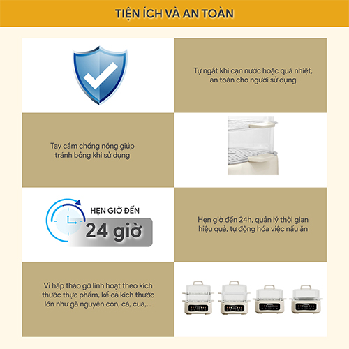 Tiện ích và an toàn : hẹn giờ lên đến 24h, tự ngắt khi quá nhiệt, khi cạn nước