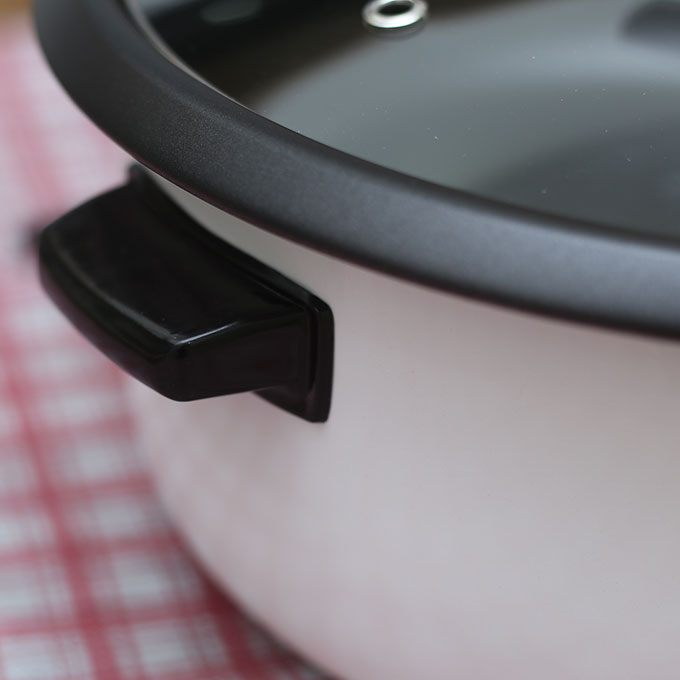 Lòng nồi có lớp chống dính Whitford (USA) dày dặn, an toàn cho sức khỏe, chị lấy thức ăn dễ dàng, không bị dính, khi vệ sinh lại nhanh chóng. Quai cầm bằng nhựa đen cực sạch sẽ và tiện dụng khi nhấc, bưng, bê, di chuyển tới vị trí nào đó bạn muốn. Nút điều khiển xoay đơn giản dễ sử dụng cùng đèn báo cho việc theo dõi quá trình nấu đơn giản và hiệu quả hơn. Trên nắp có tay nhựa trắng như hình con hạc đang bay làm sinh động hơn chi tiết sản phẩm. Nắp nồi trong suốt bằng thủy tinh cao cấp, chịu nhiệt tốt, dễ dàng quan sát thực phẩm bên trong.