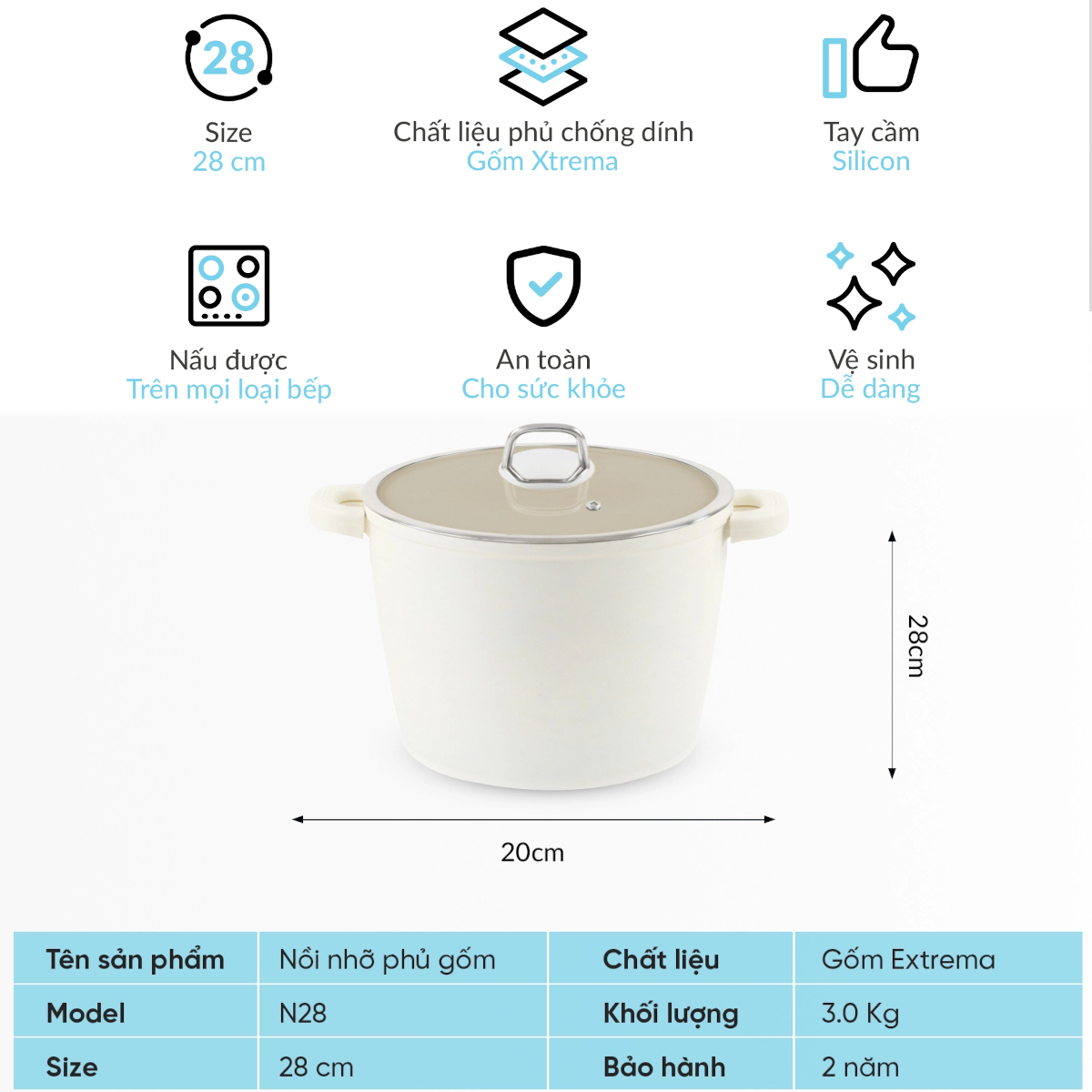 Nồi luộc gà chống dính phủ gốm Hàn Quốc dung tích 10L size 28cm Tên sản phẩm: Nồi luộc gà nhôm chống dính phủ gốm Model: N28 Kích thước: Ø28 x cao 20cm (đường kính miệng 28cm, cao 20cm,