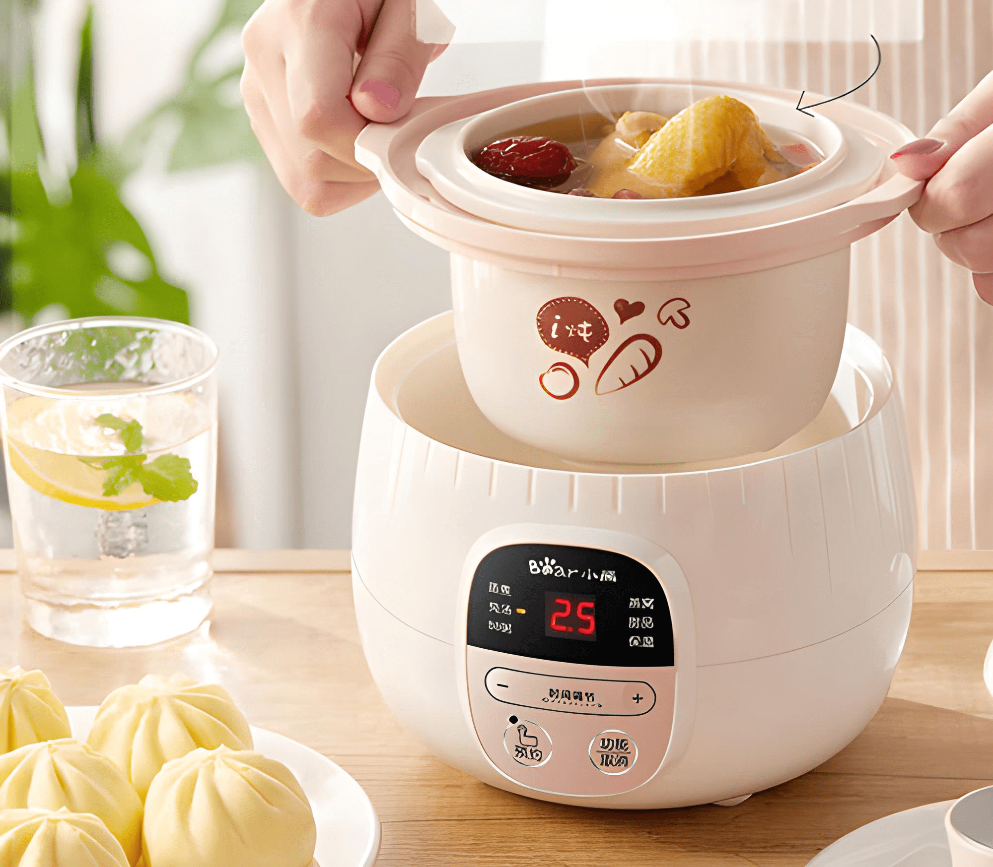 VỪA LÀ NỒI NINH HẦM CHÁO CÁCH THUỶ VỪA LÀ NỒI HẤP   Thiết kế trang nhã, chất liệu cao cấp Nồi hầm điện Bear thiết kế đơn giản, trang trọng. Nhựa PP và gốm