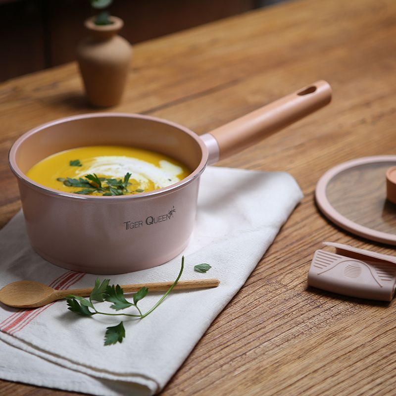 Nồi quánh Ceramic từ tính cao cấp hiệu Tiger Queen Series Lima 3 lớp kim loại được phủ 2 lớp gốm Ceramic thân dầy 2.5mm chống dính và đáy 9 lớp dầy 3.5mm, chống trầy xước màu hồng hoa anh đào với công nghệ tráng men hiện đại nhất "Hard Anodized" không tróc men, chống gỉ sét, chống ăn mòn, giữ và gia nhiệt lâu hơn giúp thức ăn mau chín tiết kiệm thời gian và nhiên liệu, thiết kế nắp thủy tinh chịu nhiệt chống trào, tay cầm dài chống nóng, sử dụng trên bếp gas, bếp hồng ngoại, bếp từ và máy rửa chén, gồm 02 món (1 nồi quánh và 1 nắp thủy tinh 18cm).