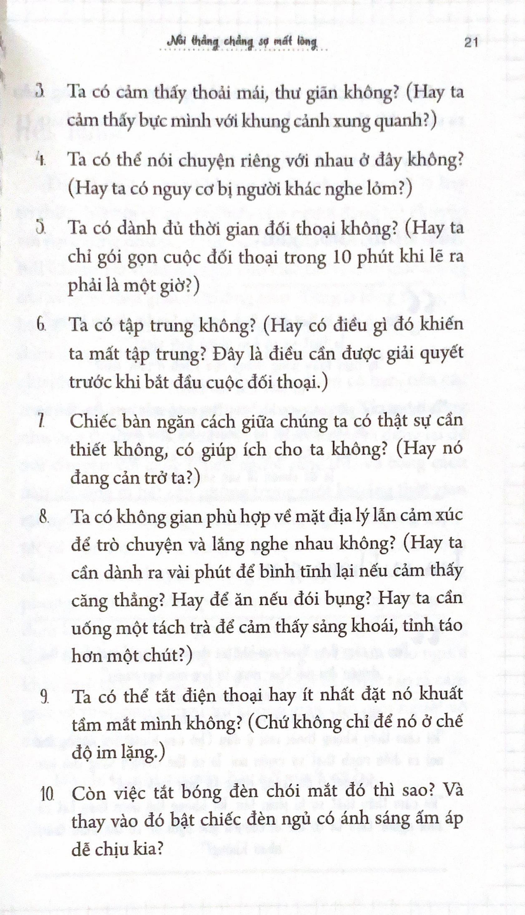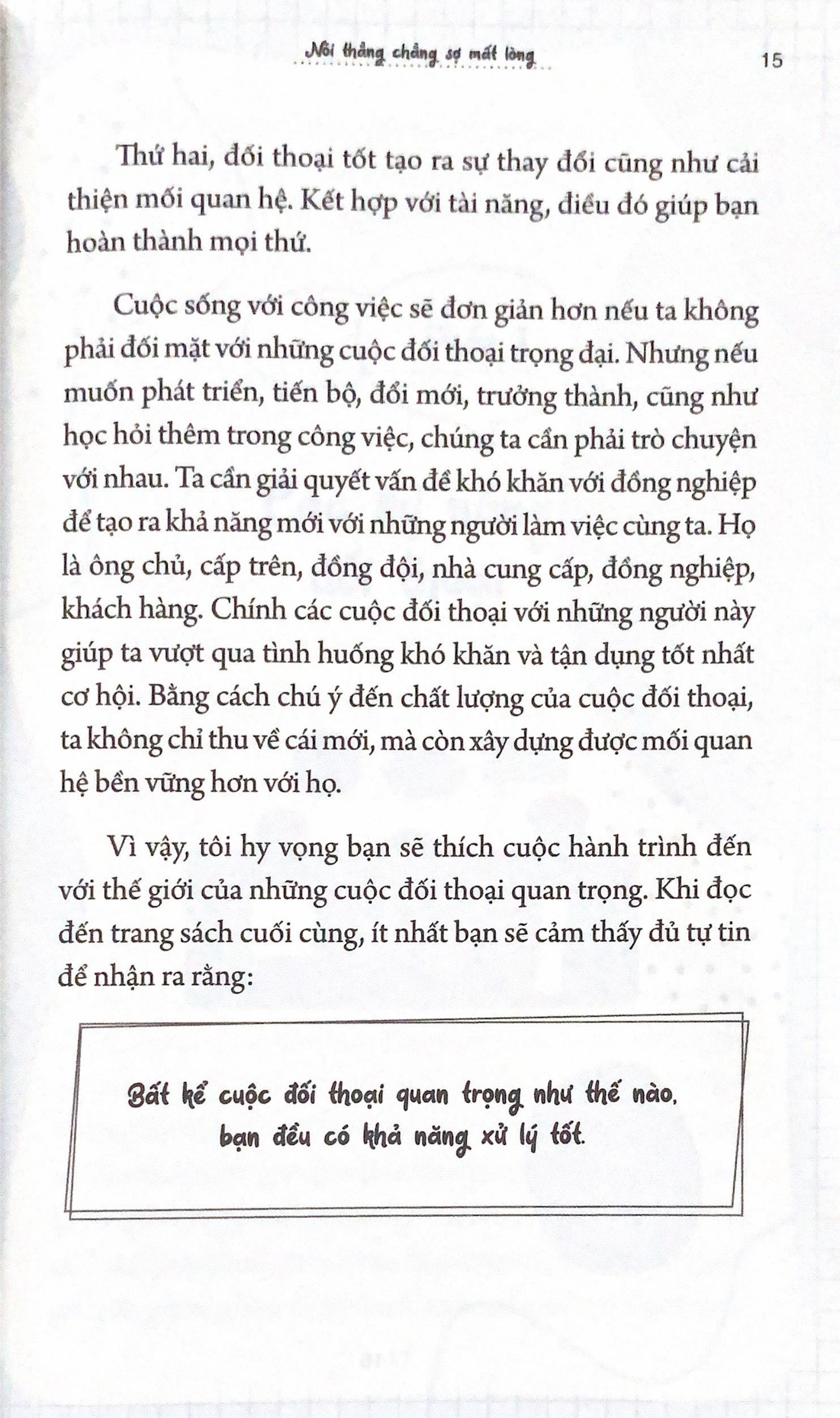 - Giới thiệu Nói Thẳng Chẳng Sợ Mất Lòng “Một trong những cuốn sách xuất sắc nhất mà tôi từng đọc.” – Andrew Forsyth, độc giả Amazon “Sách tập trung vào việc phát triển những kỹ năng thực tế và cụ thể, đồng thời đưa ra những công cụ dễ dàng ứng dụng và đưa vào thực tiễn.” – Francesca, độc giả Amazon Cuộc sống và công việc sẽ đơn giản hơn nếu bạn hiểu và nắm rõ những gì diễn ra bên trong một cuộc đối thoại hiệu quả. Từ đó, bạn có thể làm chủ tâm trí để có được sự tự tin cần thiết nhằm xử lý nỗi sợ hãi và giải quyết được mọi vấn đề. NÓI THẲNG CHẲNG SỢ MẤT LÒNG là chìa khóa vàng giúp bạn sở hữu 10 kỹ năng đối thoại hiệu quả, tinh tế và khéo léo. Bạn nên luyện tập các kỹ năng này thường xuyên để biến cuộc đối thoại nhàm chán, tầm thường trở nên thú vị, chất lượng. Đồng thời, sách còn phác thảo một số tình huống phổ biến, đặc biệt trong môi trường làm việc, và gợi ý cho bạn cách áp dụng 10 kỹ năng này vào thực tế sao cho thích hợp, hữu dụng