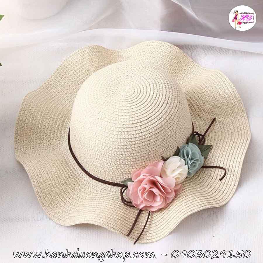✨Nón cói đi biển trẻ em vành gợn sóng, gắn nơ 3 hoa vải thời trang dành cho bé từ 3 đến 7 tuổi, có dây quai nón - Hạnh Dương